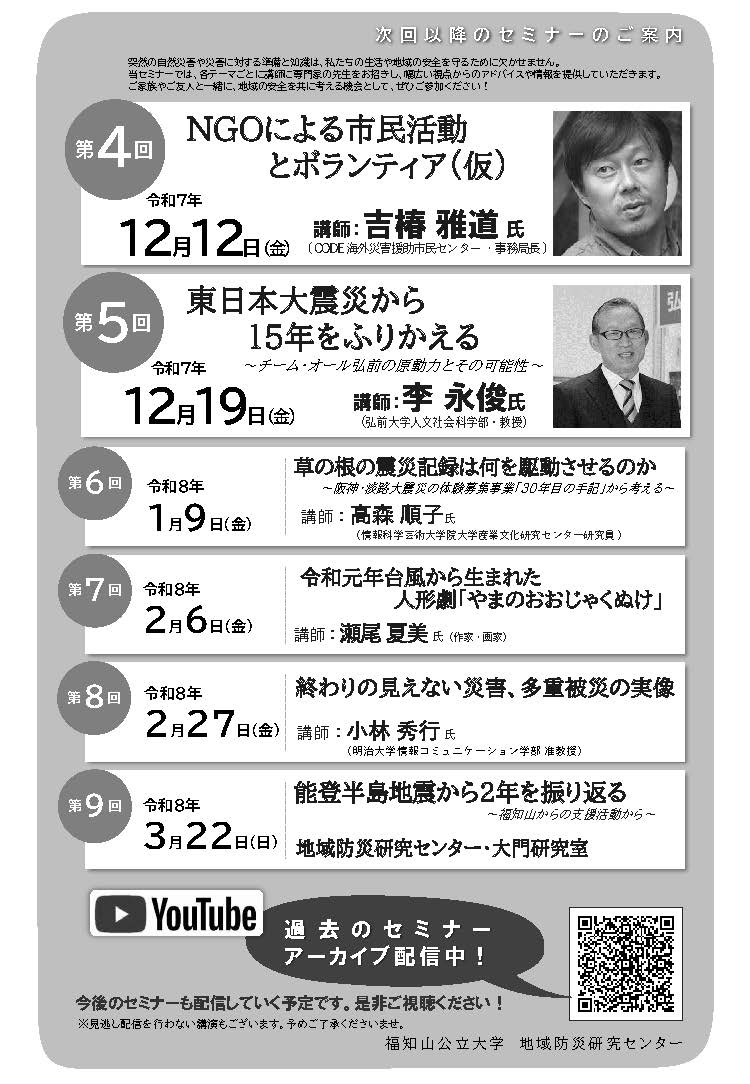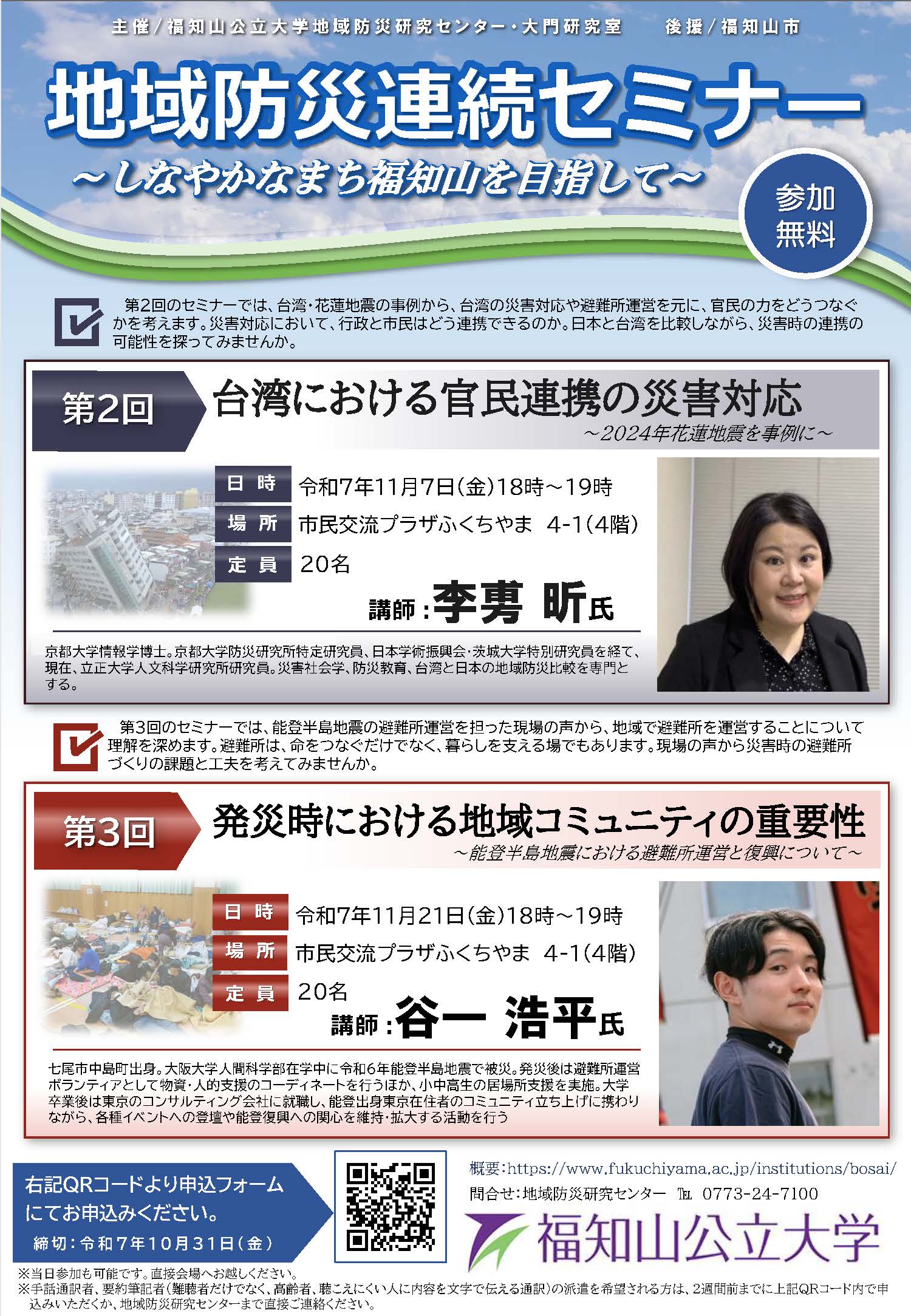 2025年11月7日(金)・21日(金)、本学地域防災研究センター及び本学地域経営学部・大門大朗研究室主催により第2・3回地域防災連続セミナー「しなやかなまち福知山を目指して」を市民交流プラザふくちやま(福知山市)で開催します。本セミナーは、今年度中に全9回の開催を予定しています。関心のある方はどなたでも受講可能ですので、ぜひお申込みください。