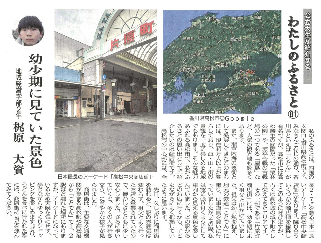 両丹日日新聞に梶原大資さん(2年生)の記事が掲載されました レポート 2025.10.22 両丹日日新聞(2025年10月21日付け)に、「公立大生が紹介する“わたしのふるさと Vol.81”」として、梶原大資さん(地域経営学部2年生)の記事が掲載されました。記事では、梶原さんの出身地・香川県高松市にある日本最長のアーケードを誇る「高松中央商店街」と、そこで過ごした梶原さんの思い出が紹介されています。 (両丹日日新聞社提供・無断複製及び転載を禁じます) 前回の記事はこちら ツイート