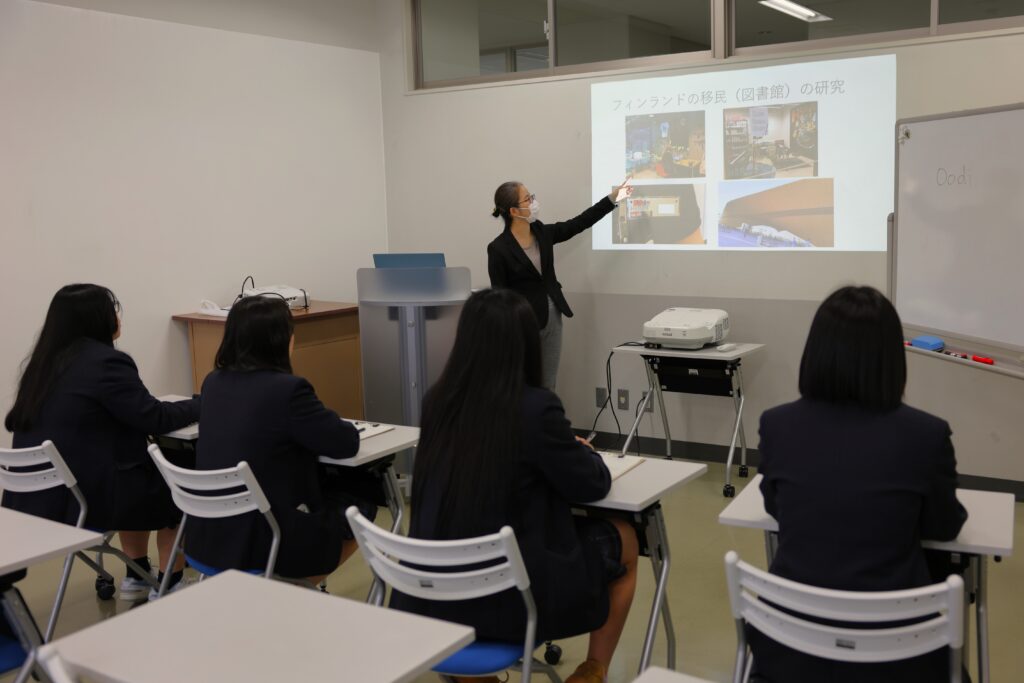 また、大谷准教授がフィンランドの図書館「Oodi」で撮影した写真を用いて、楽器演奏が可能なスタジオや3Dスキャナーなどを備えたスペースなど、図書館の枠を超えた多機能な施設についても紹介があり、生徒の皆さんは異なる文化のあり方に関心を持ち、熱心にメモを取る姿が見られました。