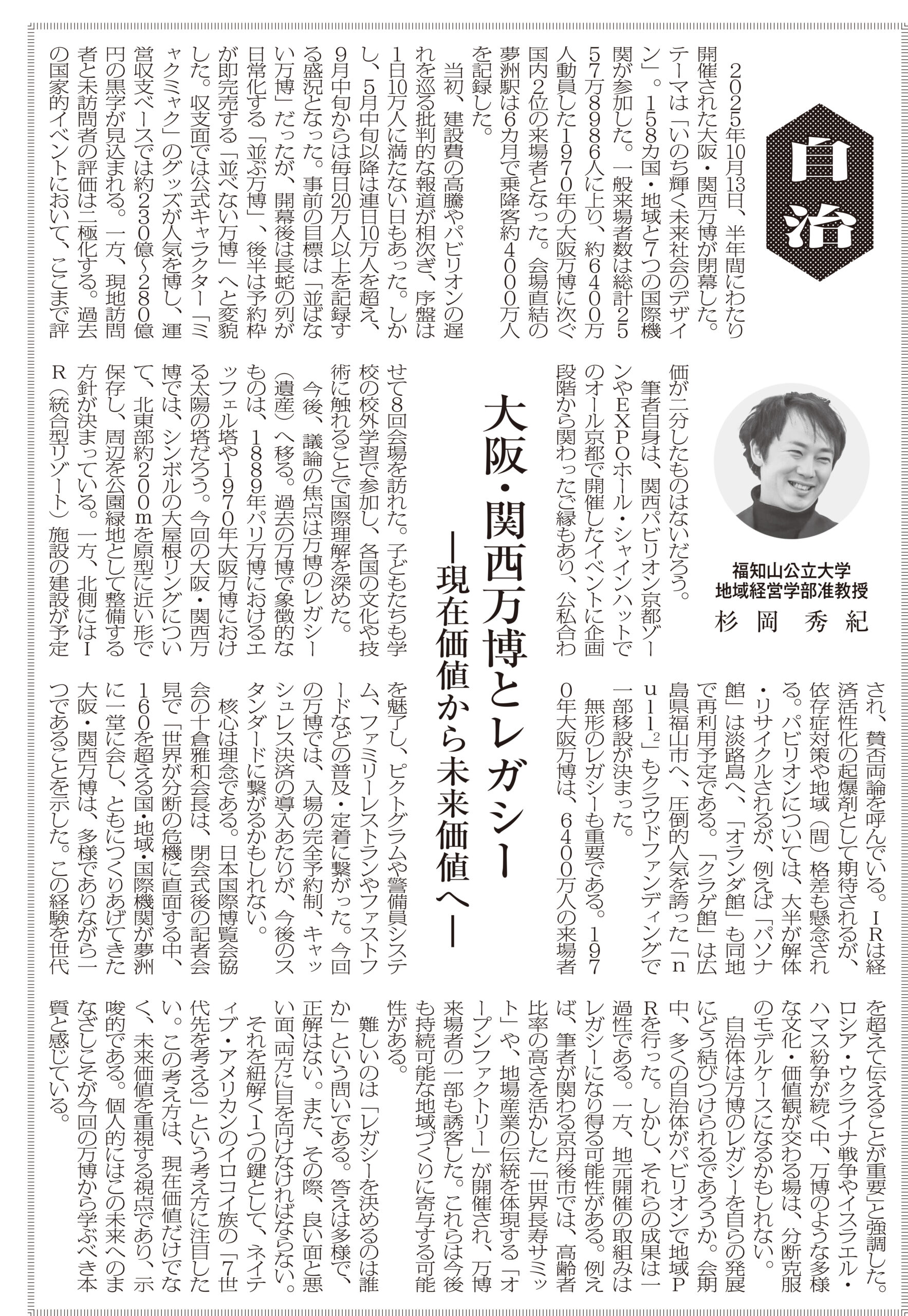 地方自治専門紙「自治日報」(2025年10月27日付)に、地域経営学部・杉岡秀紀准教授が寄稿しました。
