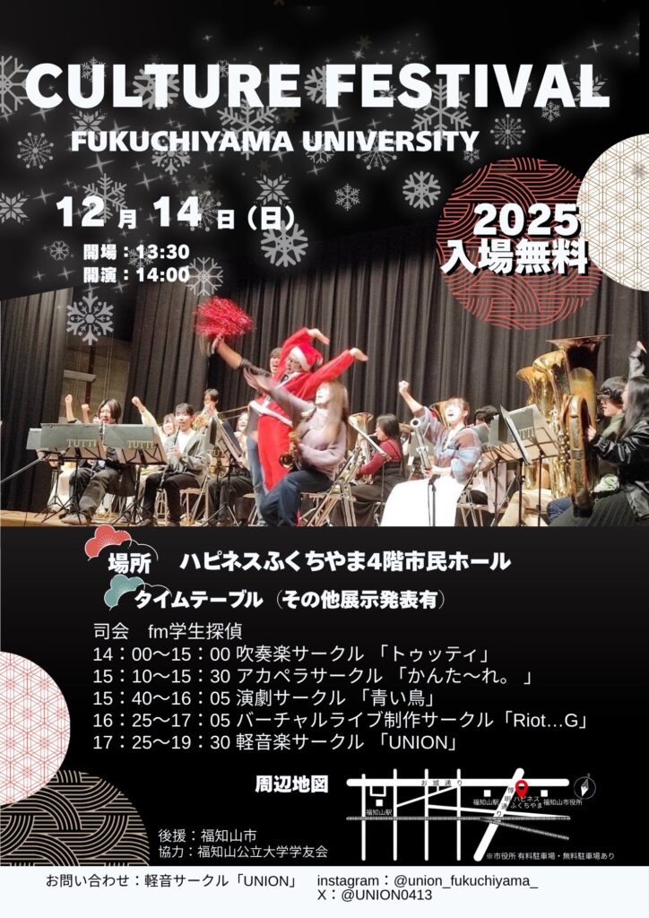 2025年12月14日(日)、ハピネスふくちやま4階市民ホールにて、「第3回福知山公立大学 カルチャーフェス」を開催します。