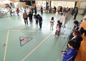 本学学生は、綿菓子、駄菓子、焼き鳥、ドリンクの販売や、くじ引き、総合窓口、ビンゴ大会のお手伝いを行ったほか、本学学生が考案したニュースポーツ「カワイアングル」という室内ゲームを実施し、小学生以下の子どもや保護者、お年寄りの方など約30人が楽しみました。