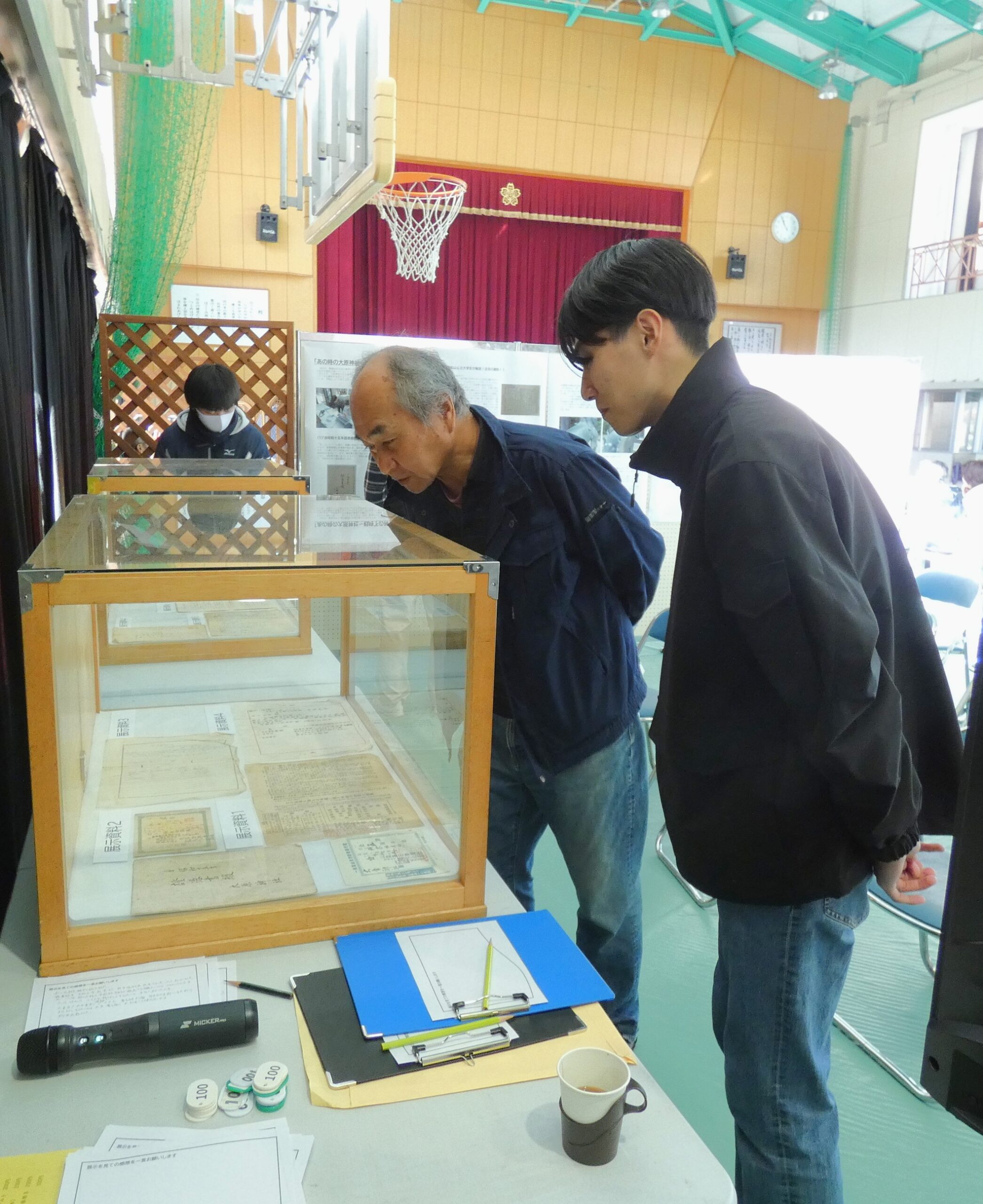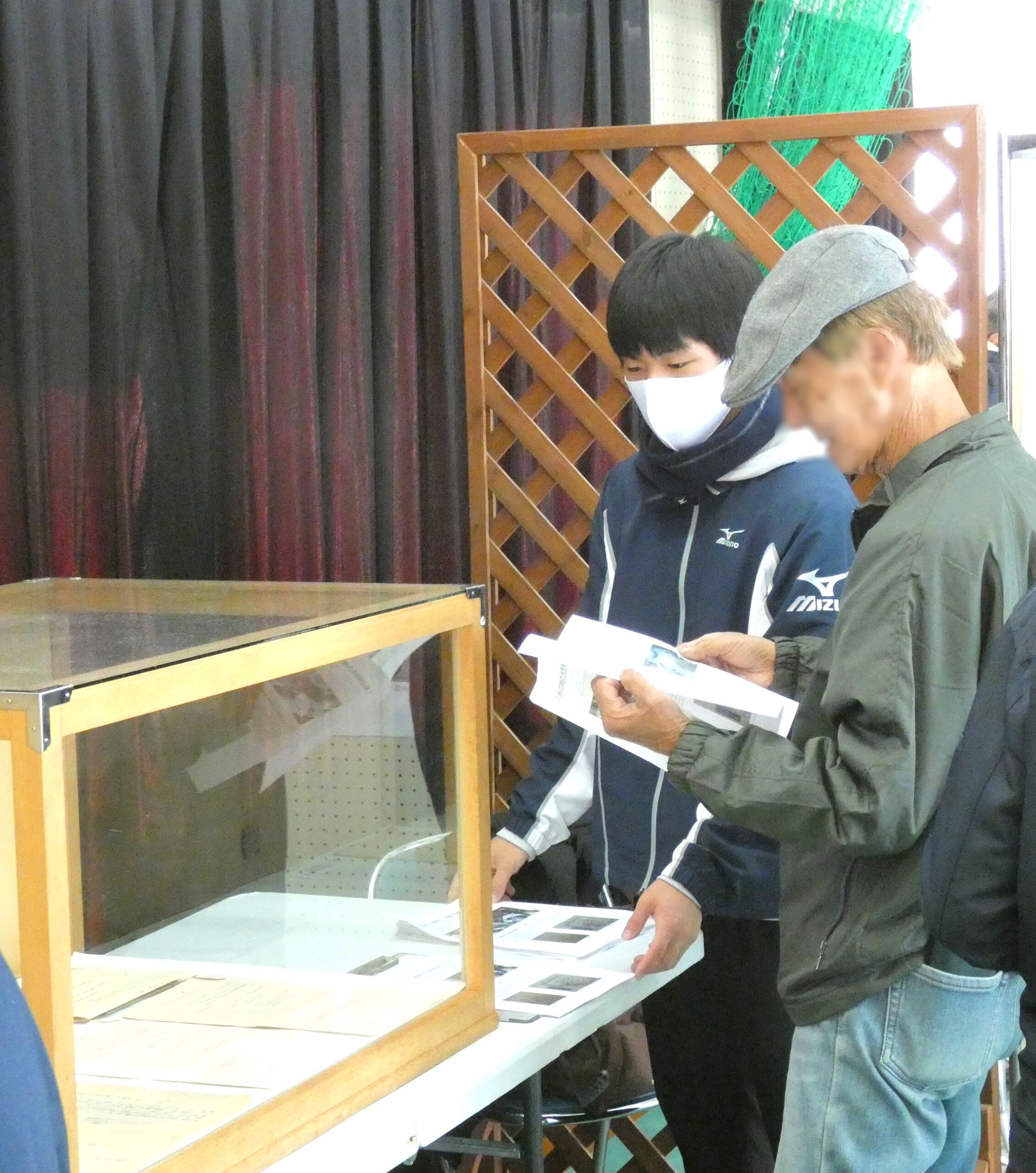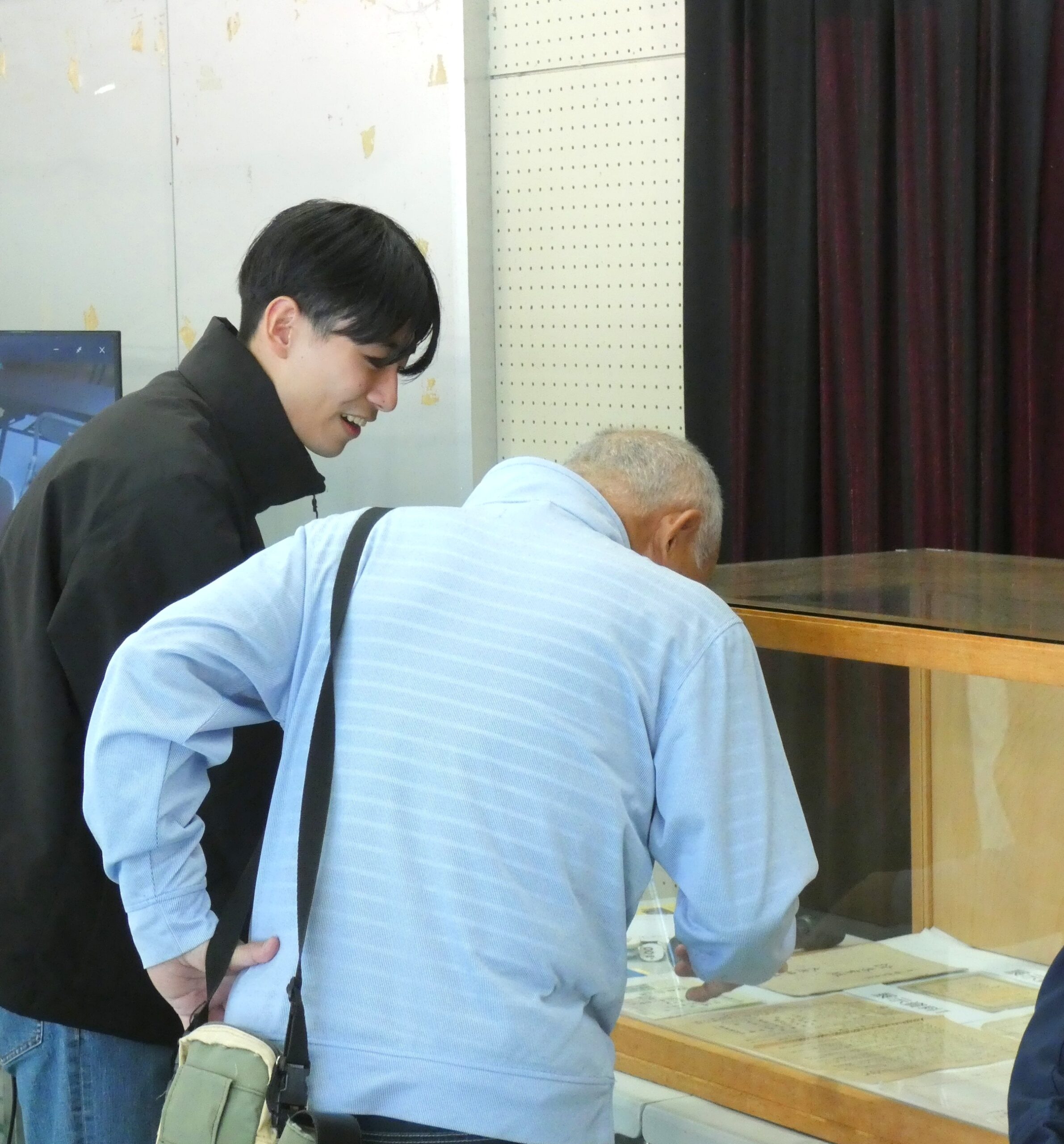 2025年、戦後80年を迎え戦争の記憶は遠のくばかりです。しかし、身近なところに戦時下の状況を伝える資料が残っていることもあります。今回、福知山公立大学地域経営学部小山元孝教授とゼミ生により、大原神社の古文書等を調査した際に、こうした戦時下の神社やくらしの様子を窺うことのできる資料を発見することができました。今回はその一部12点を展示するとともに、調査にあたった地域経営学部小山ゼミ3回生の陣内誠志君と那須寛太君が来場者向けの展示解説を実施しました。