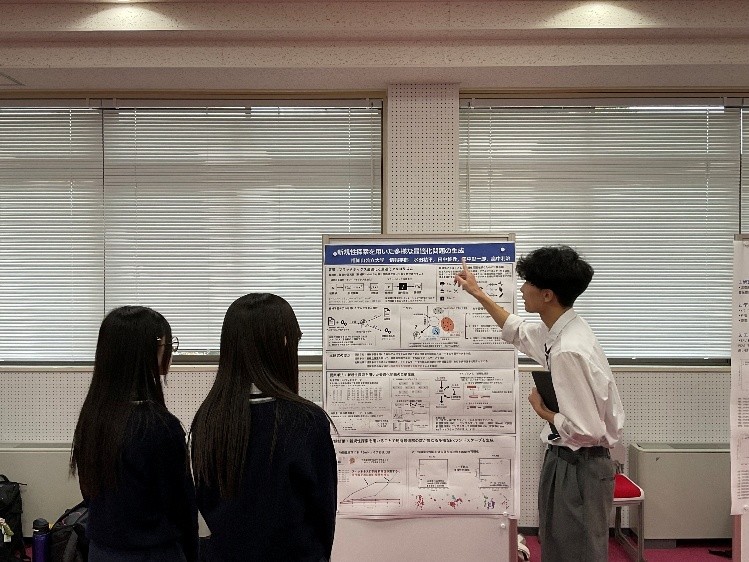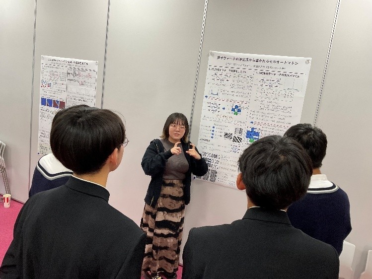 本学からは、情報学部の学生と大学院生が教員とともに参加し、ゼミで取り組んでいる研究を発表したり、高校生が行うポスター発表に質問やアドバイスを行ったりして、交流を楽しみました。