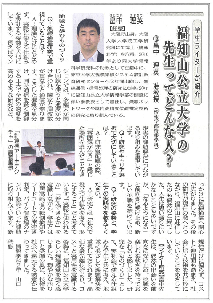両丹日日新聞(2025年11月10日付)にて、連載企画「学生ライターが紹介 福知山公立大学の先生ってどんな人?」の第13回として、情報学部の畠中理英准教授を紹介する記事が掲載されました。