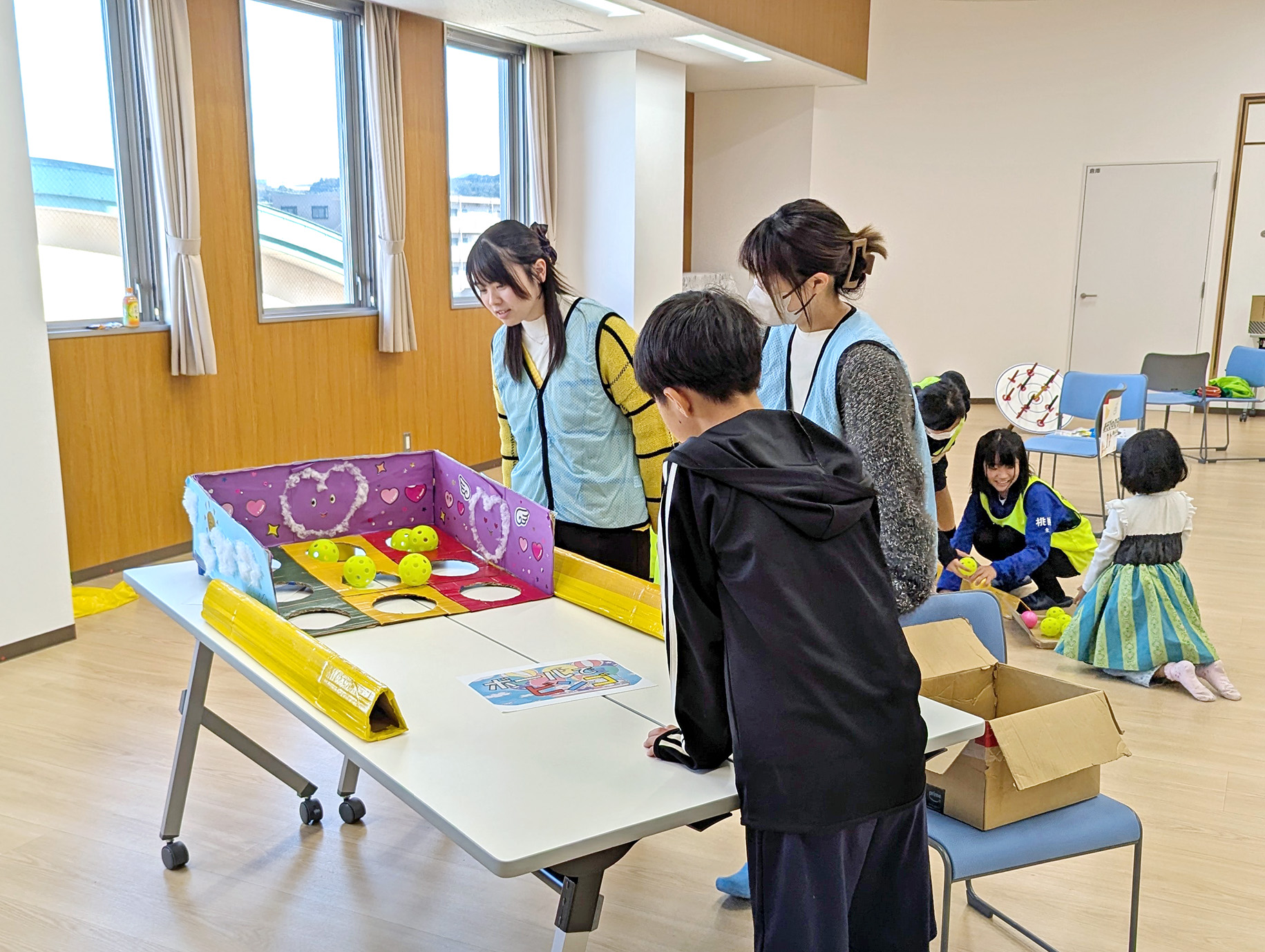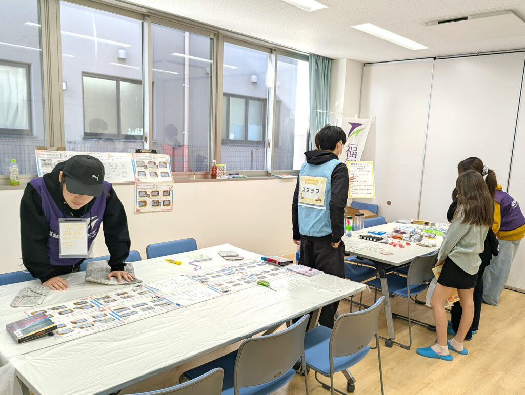 本学の学生団体では、七福ふっこう隊が能登震災ボランティアの活動写真展示と防災グッズのワークショップを、ふく子屋は公立大生と遊べる広場を開設しました。各催しには、桃映中学校の生徒がボランティアとして参加し、運営をサポートしました。
