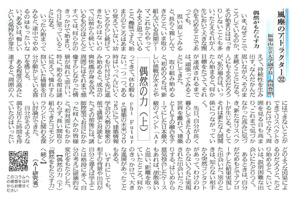 両丹日日新聞(2025年11月18日付)に西田副学長が寄稿したコラム「風塵のアトラクター㉜ 偶然の力(上)」が掲載されました。