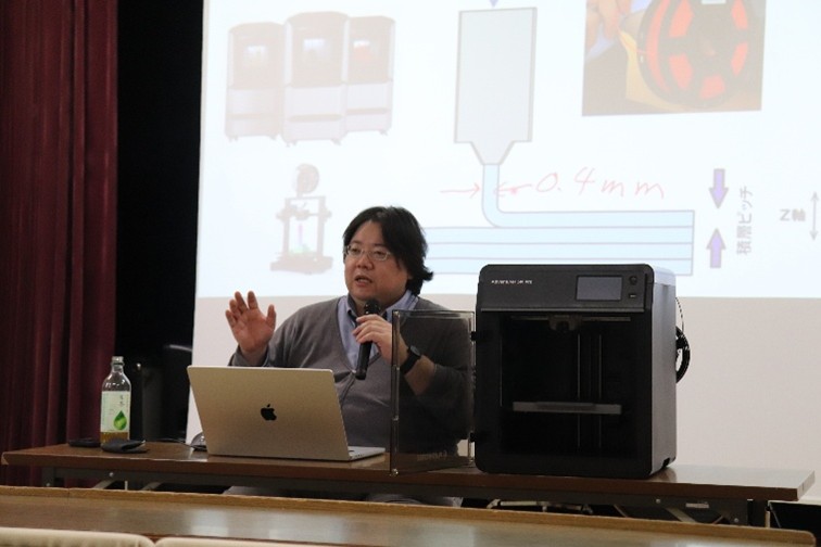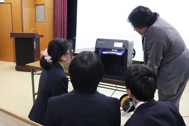 講義は「3D プリンタの仕組みの理解と活用について」と題して行われ、生徒のみなさんは3Dプリンタの種類や原理に関する授業を受けたあと、実際にFusion360を使ってモデリングを行い、3Dデータの作成の仕方から作品のプリントアウトまでの一連の流れを体験しました。