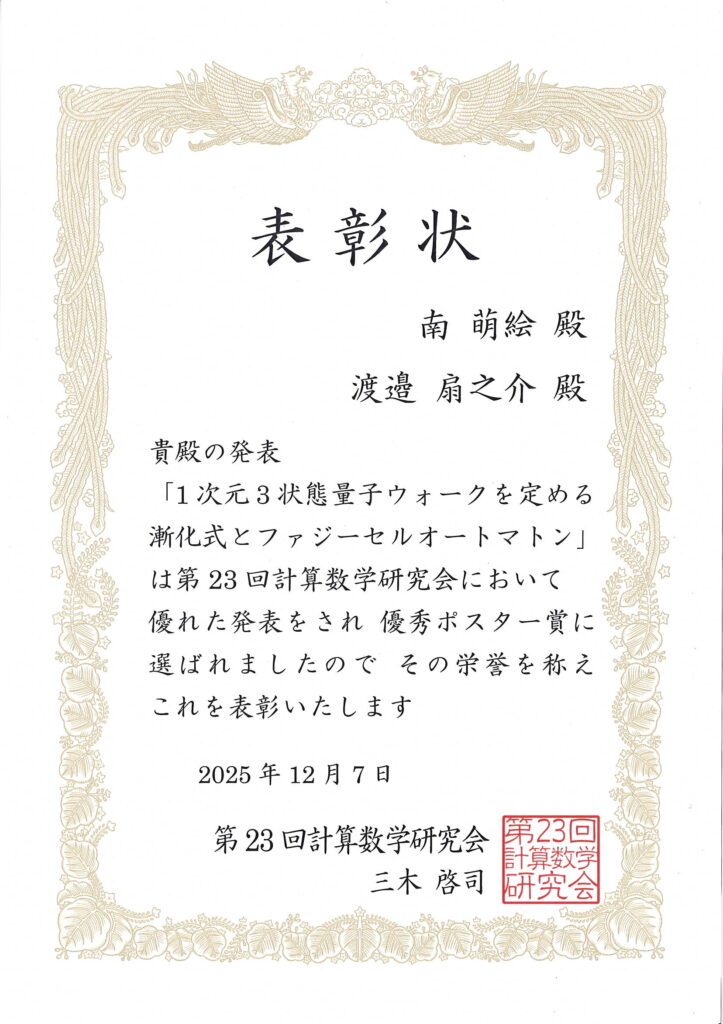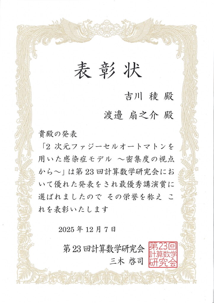 2025年12月5日(金)~7日(日)に開催された『第23回 計算数学研究会』において、本学の大学院生および学部生がそれぞれ優秀な成果を発表し、最優秀講演賞および優秀ポスター賞を受賞しました。