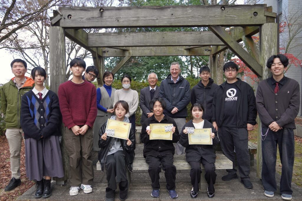当日は、本学の学生8名が登壇し、今回のテーマスピーチ「Follow Your Dream」を発音やリズムに注意しながら暗唱しました。全員の発表が終了した後、審査員を務めたAnthony Walsh准教授(地域経営学部)と塩見和広特命教授、事務局蘆田氏による講評が行われ、続いてAnthony Walsh准教授から各賞の発表があり、黄宏軒国際センター長(情報学部教授)より賞状と商品が手渡されました。