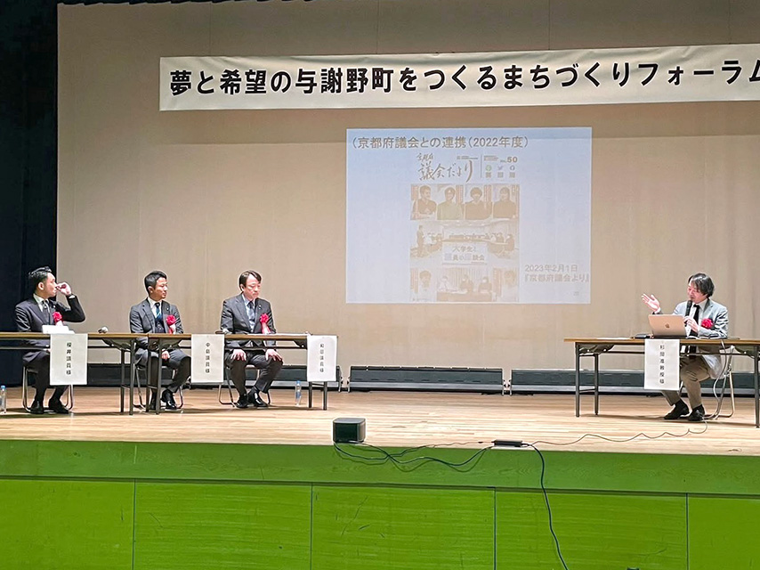 後半(第2部)では、山添藤真・与謝野町長、城﨑雅文・宮津市長、吉本秀樹・伊根町長をパネリストに迎え、「宮津・与謝地域の価値創造に向けて」をテーマとしたシンポジウムが開催され、杉岡准教授がコーディネーターを務めました。さらに、中島たけふみ・京都府議会議員、和田裕之・与謝野町議会議員、櫻井ゆうさく・京丹後市議会議員をパネリストとする「まちづくりにおいて議会の果たすべき責務について」をテーマとしたシンポジウムが行われ、杉岡准教授が引き続きコーディネーターを務めました。