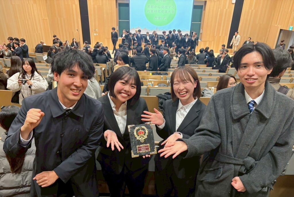 同大会は、大学コンソーシアム京都が主催し、政策系学部を有する加盟12大学の学生が、個人または団体(ゼミ等)で参加できる研究発表大会で、今年で21回目の開催となります。今年度は、予選を通過した79の個人・団体が10分科会に分かれ、政策研究の成果を発表しました。大会最終日の授賞式では、最優秀作品(論文と口頭発表を総合して最も高い評価を得た1件)に理事長賞、最も評価の高かった論文(論文重視型の上位1件)に日本公共政策学会賞、ならびに各分科会の最優秀作品に優秀賞が授与されました。