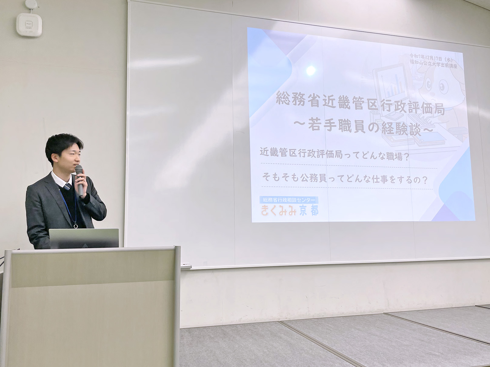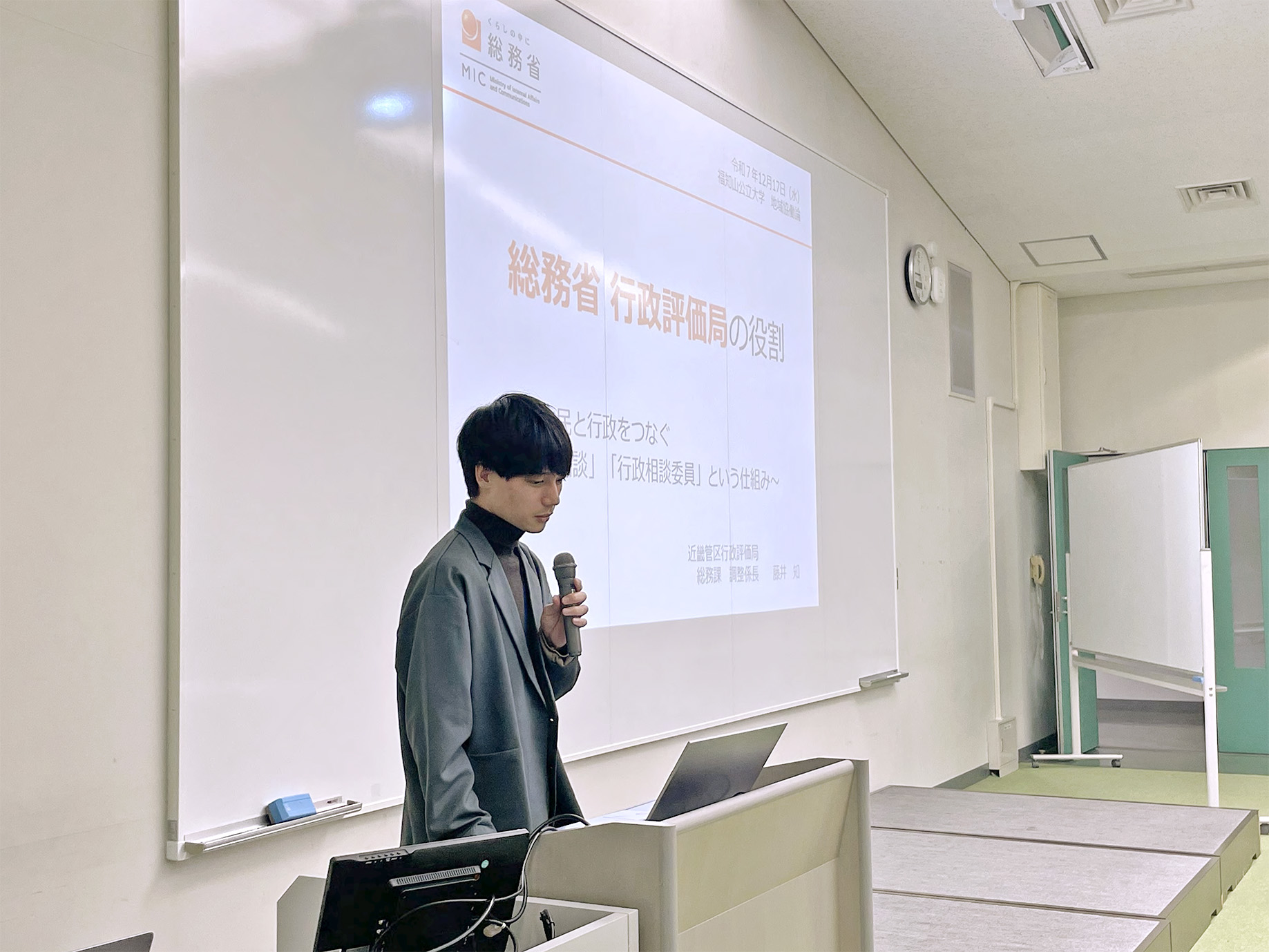 2025年12月17日(水)、地域経営学部の講義科目「地域協働論」(担当:杉岡秀紀准教授)の一環として、総務省(近畿管区行政評価局総務課、京都行政監視行政相談センター)の職員および行政相談委員の皆さんをゲストスピーカーに招聘しました。