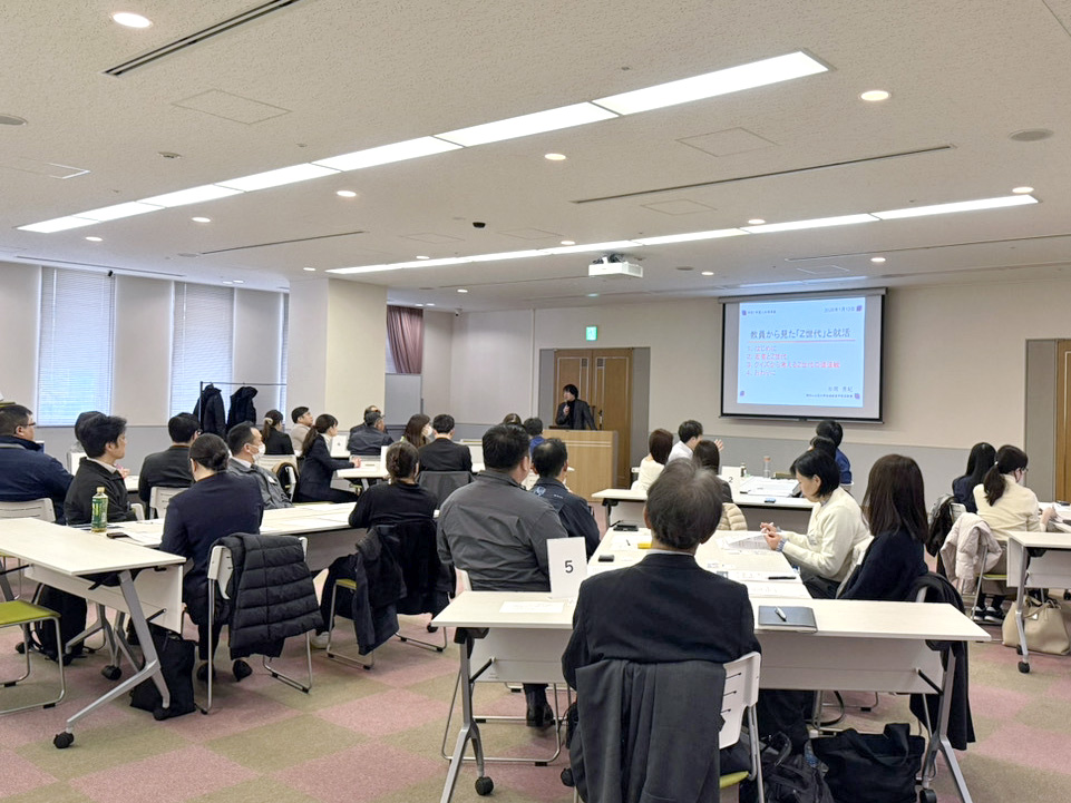 当日は南部会場の2回目として、40名弱の経営者や人事担当者が出席し、杉岡准教授から「教員から見た『Z世代』と就活」をテーマとした話題提供が行われました。休憩後の後半には、参加者全員によるワークショップが実施されました。