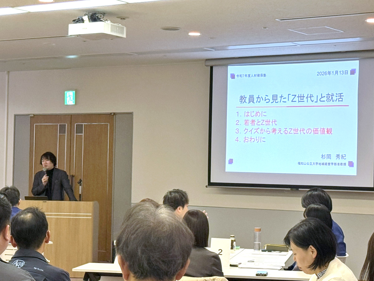2026年1月13日(火)、京都企業人材確保センター主催の「人材確保塾」が京都府民総合交流プラザ京都テルサ(京都市)で開催され、地域経営学部の杉岡秀紀准教授が登壇しました。本塾は企業支援の一環として、府内中小企業の経営者や人事・総務担当者を対象に、採用力向上を目的として毎年実施されており、昨年度からは南部会場と北部会場の両方で開催されています。