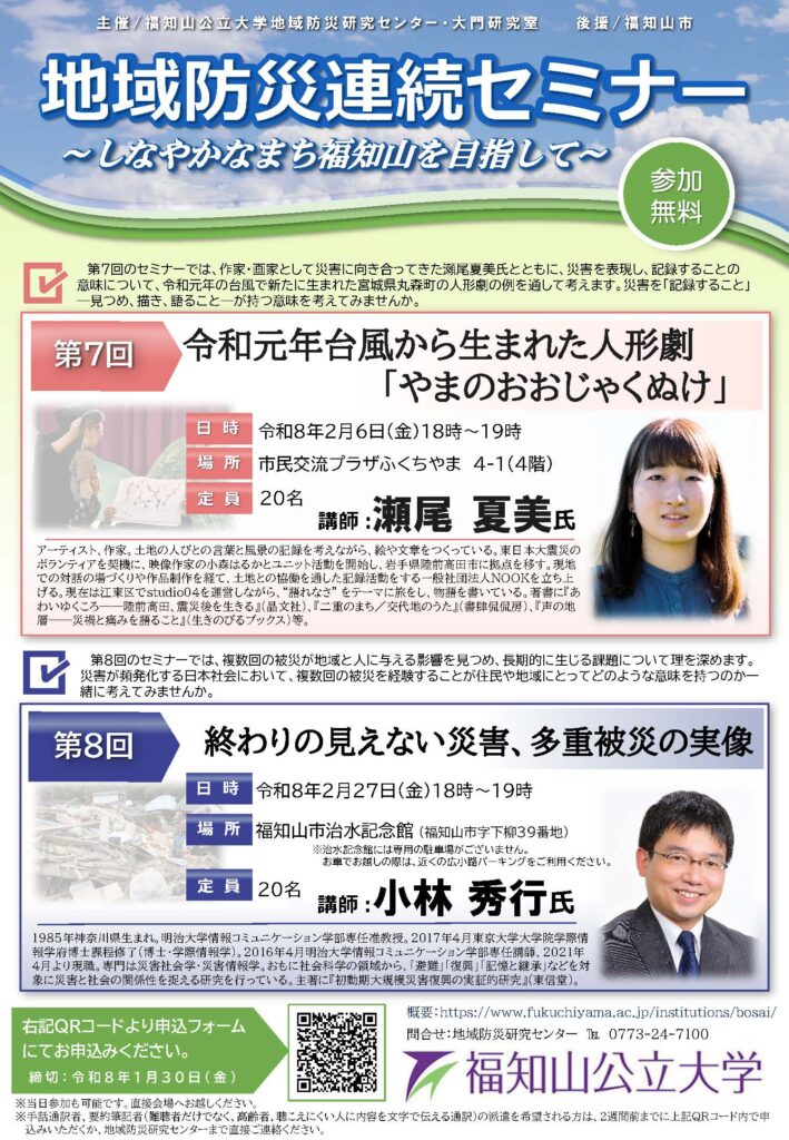 2026年2月6日(金)・27日(金)、本学地域防災研究センター及び本学地域経営学部・大門大朗研究室主催により第7・8回地域防災連続セミナー「しなやかなまち福知山を目指して」を市民交流プラザふくちやま(福知山市)で開催します。本セミナーは、今年度中に全9回の開催を予定しています。関心のある方はどなたでも受講可能ですので、ぜひお申込みください。
