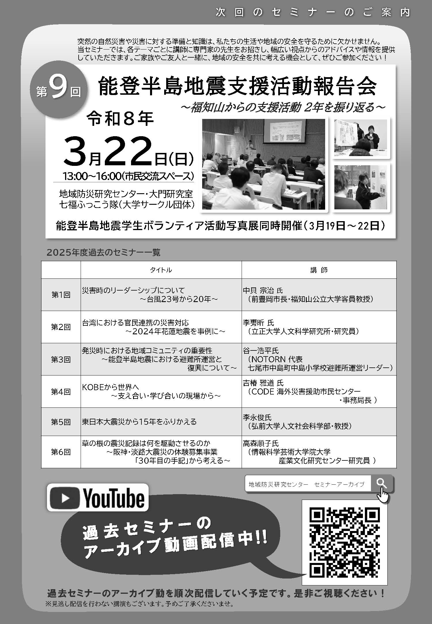 2026年2月6日(金)・27日(金)、本学地域防災研究センター及び本学地域経営学部・大門大朗研究室主催により第7・8回地域防災連続セミナー「しなやかなまち福知山を目指して」を市民交流プラザふくちやま(福知山市)で開催します。本セミナーは、今年度中に全9回の開催を予定しています。関心のある方はどなたでも受講可能ですので、ぜひお申込みください。