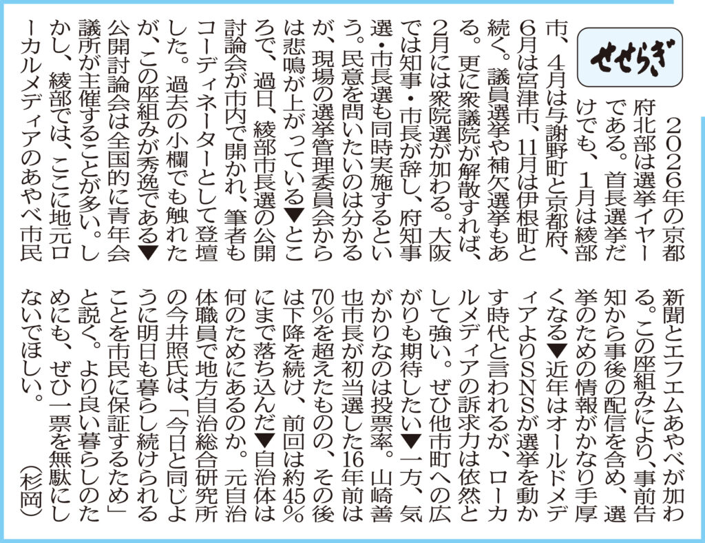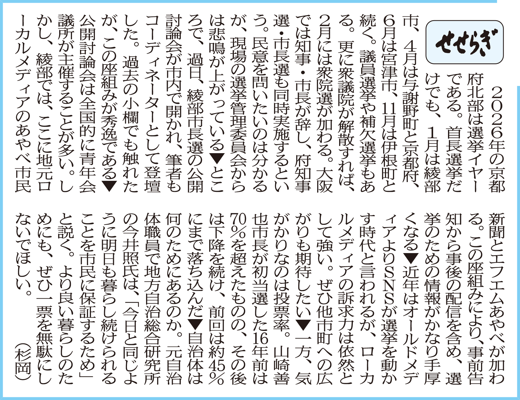 北近畿経済新聞「せせらぎ」に杉岡准教授が寄稿しました レポート 2026.01.21 北近畿経済新聞「せせらぎ」(2026年1月21日付け)に杉岡秀紀准教授(地域経営学部)が寄稿しました。 (北近畿経済新聞社提供) 前回の記事はこちら ツイート