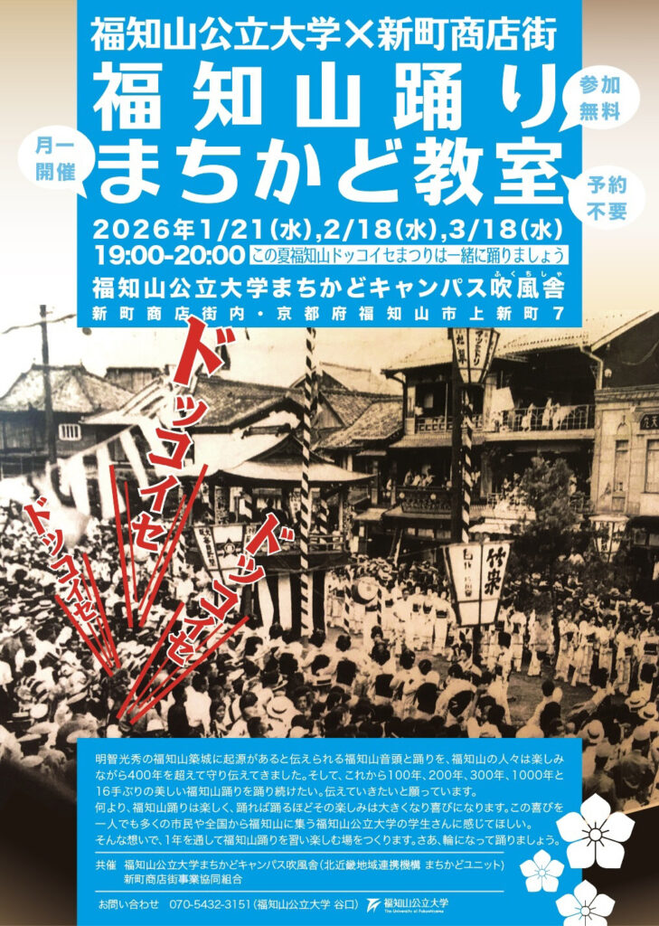 共催:福知山公立大学まちかどキャンパス吹風舎(北近畿地域連携機構 まちかどユニット)、新町商店街事業協同組合お問い合わせ:070-5432-3151(福知山公立大学・地域経営学部 谷口知弘教授)