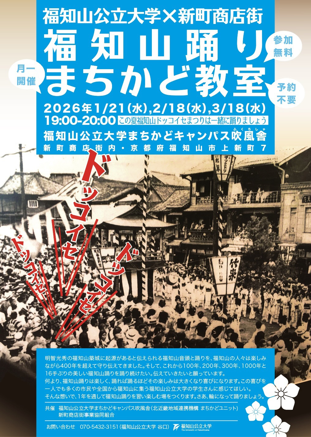 共催:福知山公立大学まちかどキャンパス吹風舎(北近畿地域連携機構 まちかどユニット)、新町商店街事業協同組合お問い合わせ:070-5432-3151(福知山公立大学・地域経営学部 谷口知弘教授)