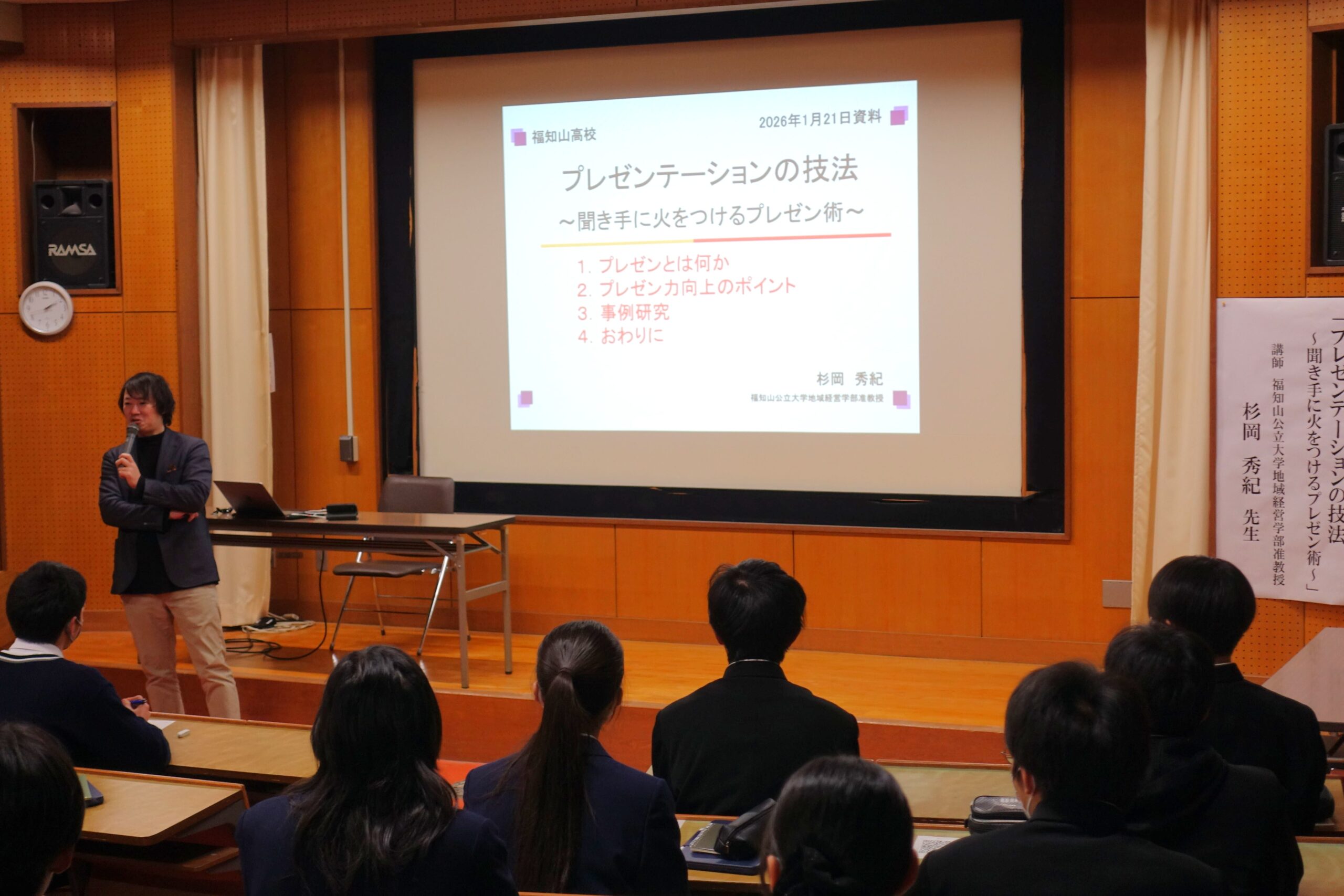 2026年1月21日(水)、京都府立福知山高校の文理科学科1年生の総合的な探究の時間「みらい学Ⅰ」最終発表に向けた発表技法に関する講義が開催され、地域経営学部の杉岡准教授が講師を務めました。