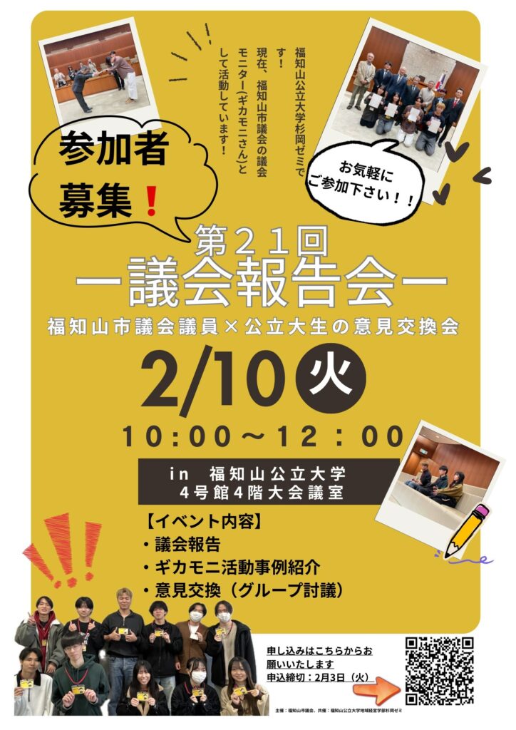 2026年2月10日(火)、福知山市議会の第21回議会報告会において本学学生と市議会議員との意見交換会を実施します。