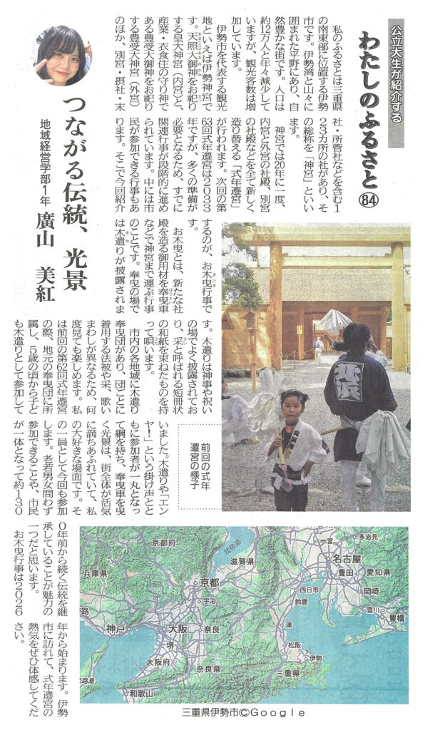 両丹日日新聞に廣山美紅さん(1年生)の記事が掲載されました レポート 2026.01.27 両丹日日新聞(2026年1月26日付け)に、「公立大生が紹介する“わたしのふるさと Vol.84”」として、廣山美紅さん(地域経営学部1年生)の記事が掲載されました。記事では、廣山さんの出身地・三重県伊勢市にある伊勢神宮で行われる「式年遷宮」について紹介しています。 (両丹日日新聞社提供・無断複製及び転載を禁じます) 前回の記事はこちら ツイート