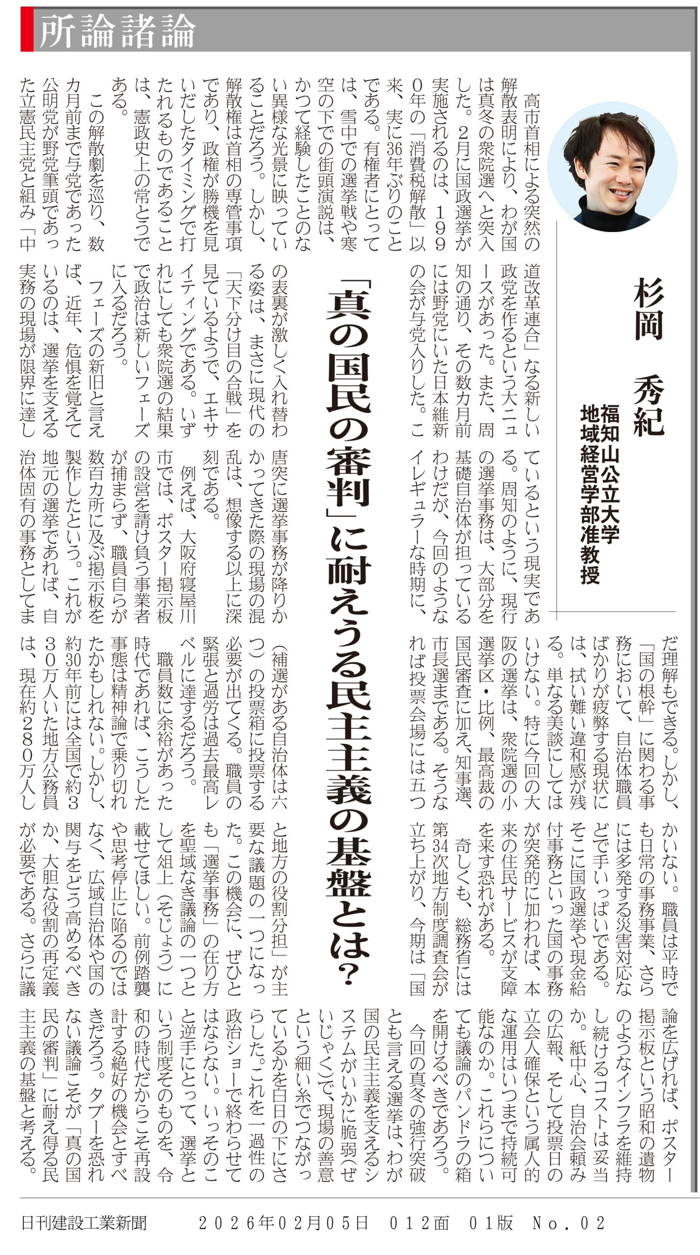 日刊建設工業新聞「所論諸論」に杉岡准教授が寄稿しました レポート 2026.02.09 日刊建設工業新聞「所論諸論」(2026年2月5日付け)に、地域経営学部・杉岡秀紀准教授が寄稿しました。 (日刊建設工業新聞社提供) 前回の記事はこちら ツイート