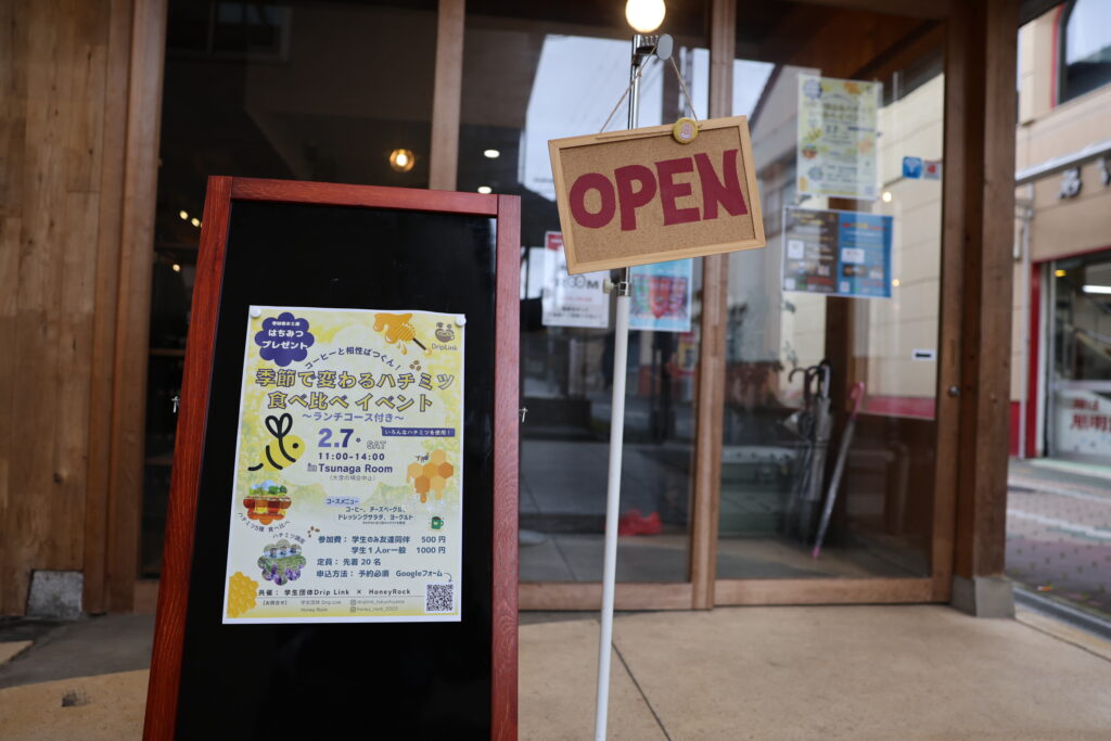 イベントのきっかけは、2025年12月にDrip LinkがTsunaga Roomで開催した「コーヒー飲み比べイベント」でした。別の用事でTsunaga Roomを訪れていたHoney Rockのご夫婦との出会いを通じて、「季節ごとに咲く花から集められるはちみつの違いや、料理と組み合わせる魅力を学生にも知ってもらいたい」とコラボレーションの提案がありました。「授業やアルバイトだけでなく、学生がもっと市街地に出て地域の方と交流できる機会を作りたい」と考えていたDrip Link代表の三木日菜子さんと意気投合し、すぐに企画化に動きました。