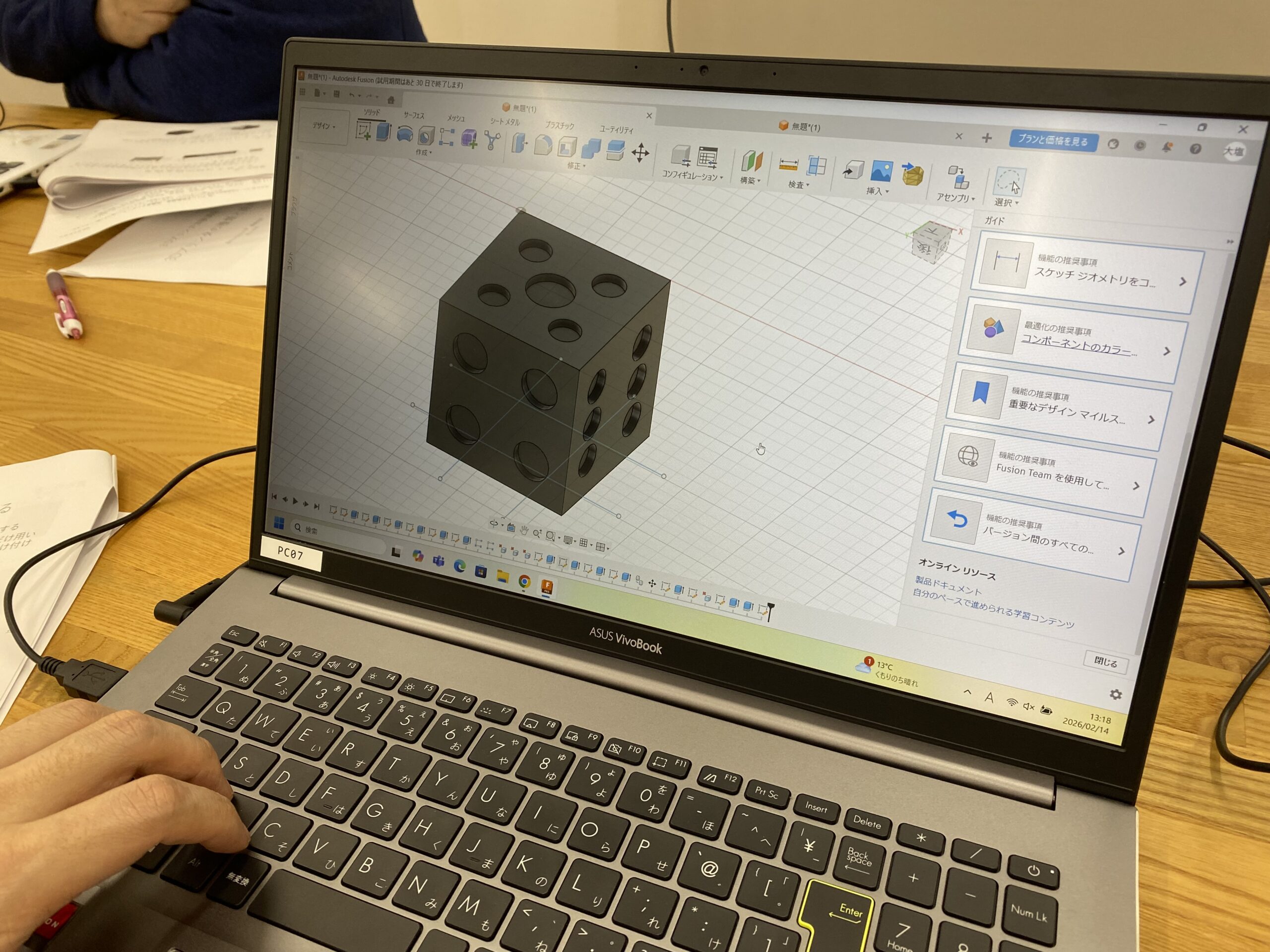 当日は、サイコロの制作をはじめ、クッキー型やふた付き小物入れの設計など、実践的なモデリングに挑戦しました。また、本学が導入している産業用3Dプリンタ(Stratasys F170)の見学も行い、用途や性能の違いについて説明を受けながら、家庭用機との比較を通して理解を深めていただきました。