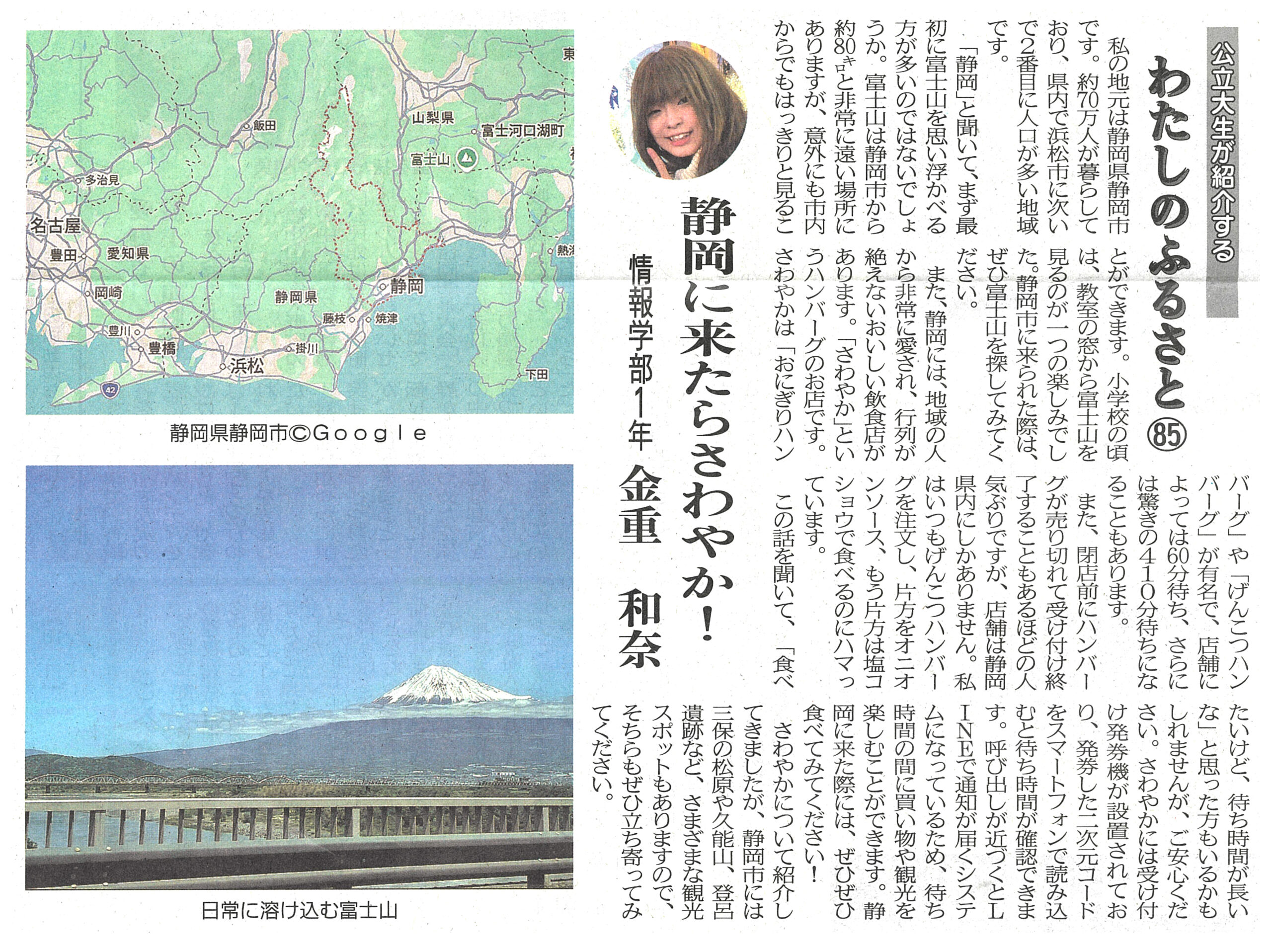 両丹日日新聞に金重和奈さん(1年生)の記事が掲載されました レポート 2026.02.17 両丹日日新聞(2026年2月16日付け)に、「公立大生が紹介する“わたしのふるさと Vol.85”」として、金重和奈さん(情報学部1年生)の記事が掲載されました。記事では、金重さんの出身地である静岡市から望む富士山の風景や、金重さんおすすめの人気飲食店を紹介しています。 (両丹日日新聞社提供・無断複製及び転載を禁じます) 前回の記事はこちら ツイート