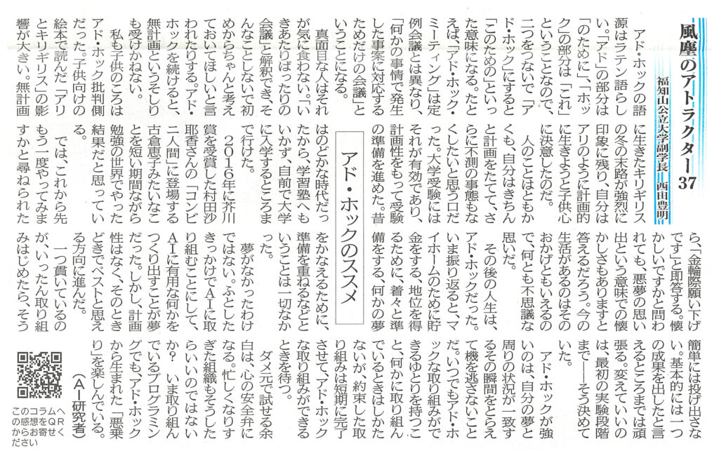 両丹日日新聞に西田副学長のコラムが掲載されました レポート 2026.02.18 両丹日日新聞(2026年2月17日付)に西田副学長が寄稿したコラム「風塵のアトラクター㊲ アド・ホックのススメ」が掲載されました。 (両丹日日新聞社提供・無断複製及び転載を禁じます) 前回の記事はこちら ツイート