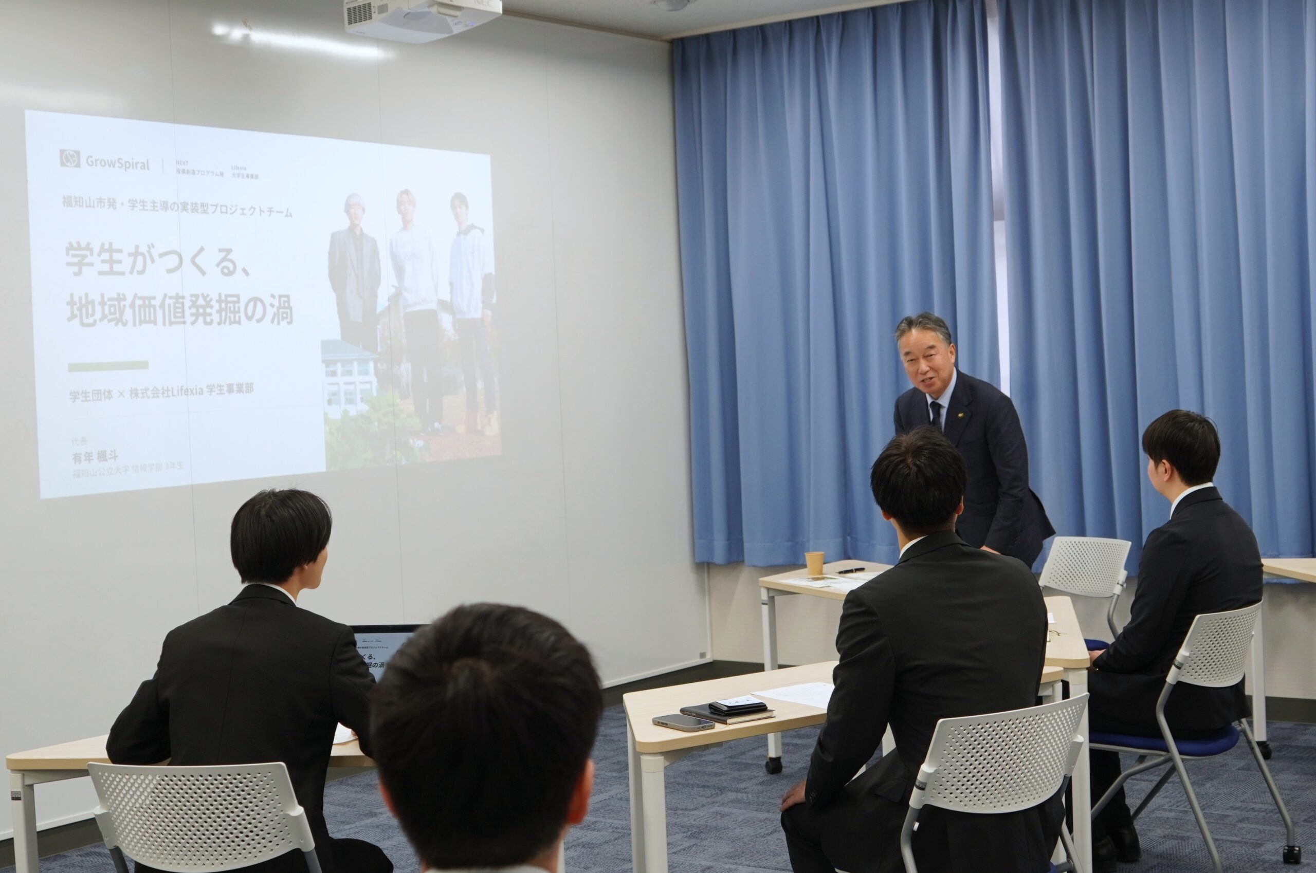 はじめに大橋一夫市長よりごあいさつをいただいた後、地域経営学部4年生の菅谷快晴さんより、GrowSpiralの活動紹介が行われました。