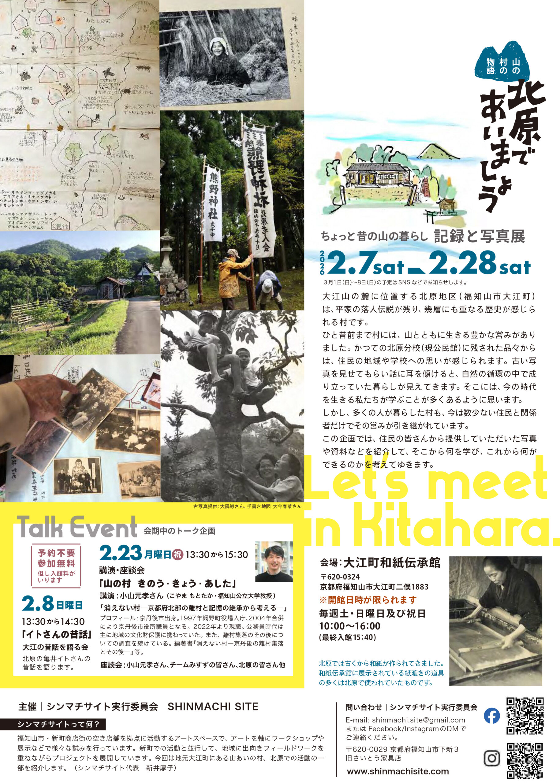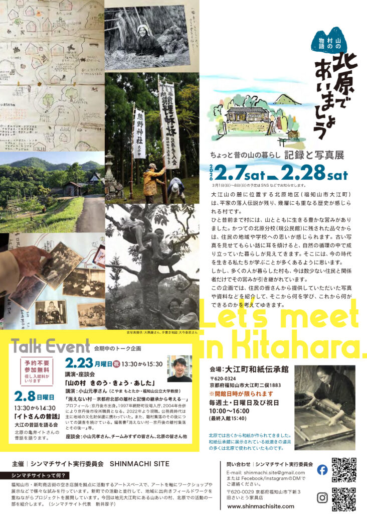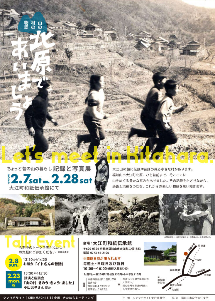 「北原であいましょう」は、福知山市大江町北原地区の昭和期の風景や暮らしを写真や資料で振り返る企画展で、2月7日(土)から28日(土)まで大江町和紙伝承館(二俣)で開催されました。同地区では、かつて紙すきや炭焼きなどが盛んで、約50戸が暮らしていましたが、現在は約10戸にまで減少しています。本企画展は、地域の歴史や暮らしの記憶を次世代へ伝えることを目的に開催されたものです。