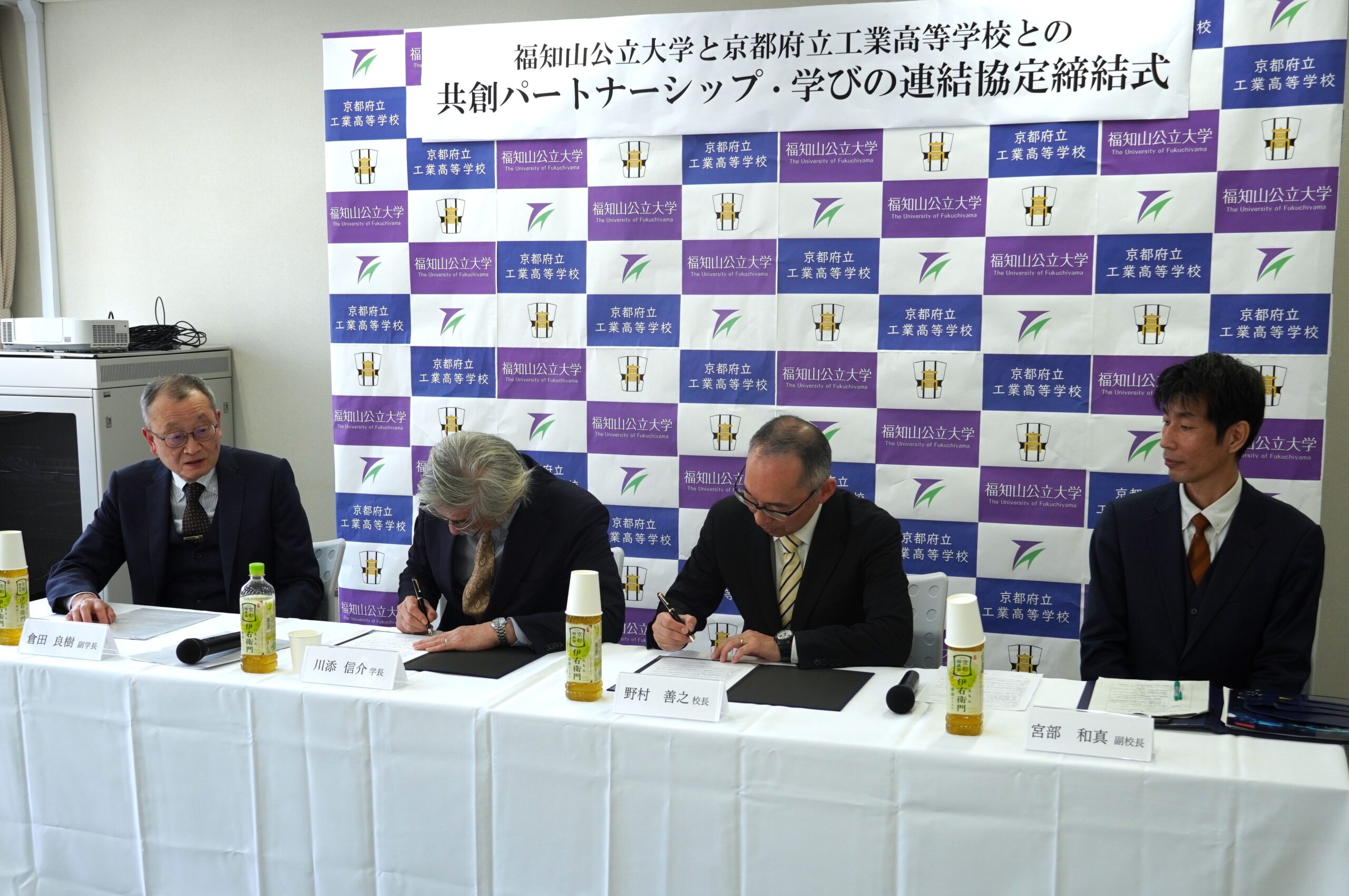 今回の協定は、京都府立工業高等学校と本学が包括的な連携のもと、学校教育の振興及び実践的技術人材の育成並びに地域社会の発展に寄与することを目的としています。協定締結式には、京都府立工業高等学校から野村善之校長と宮部和真副校長が、本学からは川添信介学長と倉田良樹副学長が出席しました。