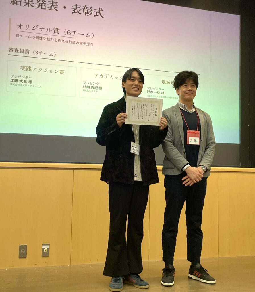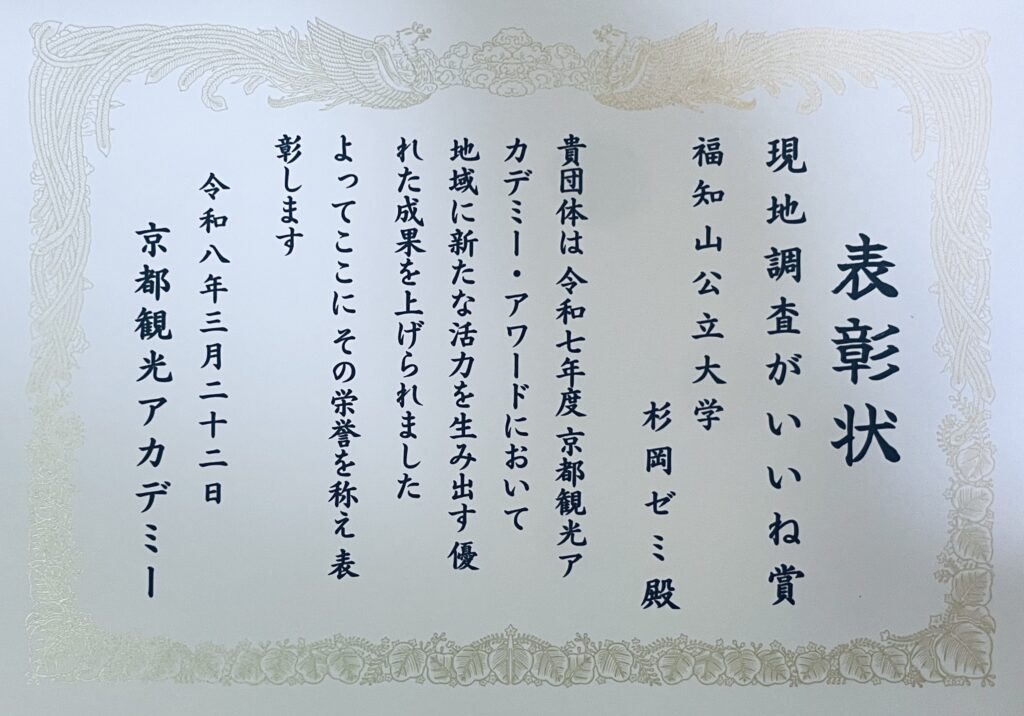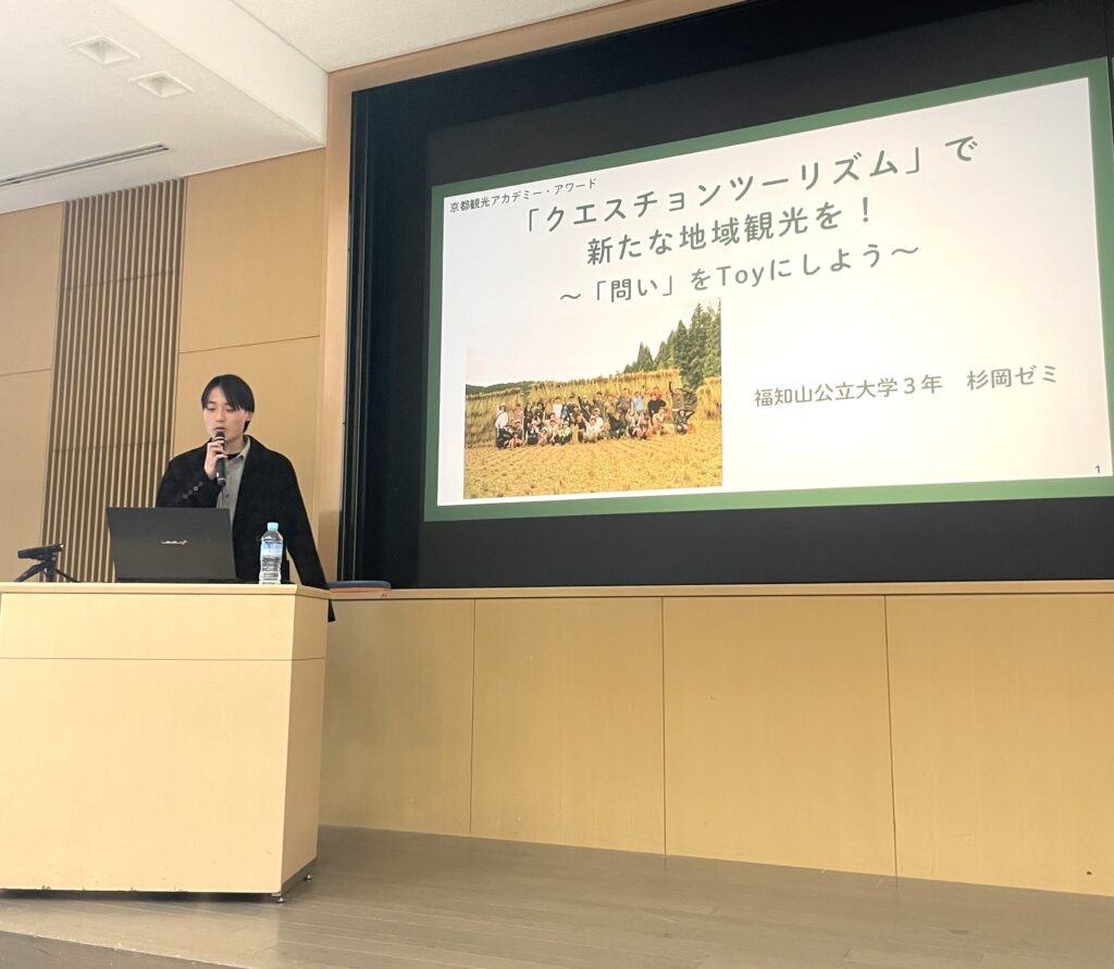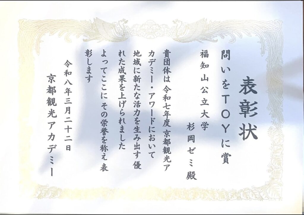2026年3月22日(日)、キャンパスプラザ京都(京都市)で開催された「令和7年度 京都観光アカデミー・アワード」(主催:公益社団法人京都府観光連盟)にて地域経営学部杉岡ゼミの学生が参加し、オリジナル賞を受賞しました。
