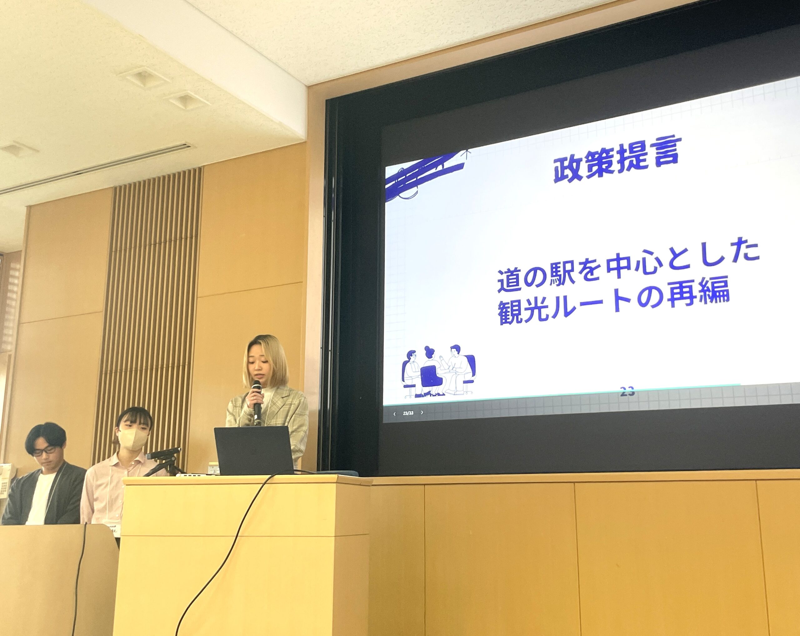 9本の発表後は、京都府副知事の鈴木一弥氏、株式会社エイチ・アイ・エス法人営業本部関西法人事業部第1営業グループリーダの工藤大昌氏、本学地域経営学部の杉岡秀紀准教授の3名が審査。9つの賞を決定し、表彰しました。