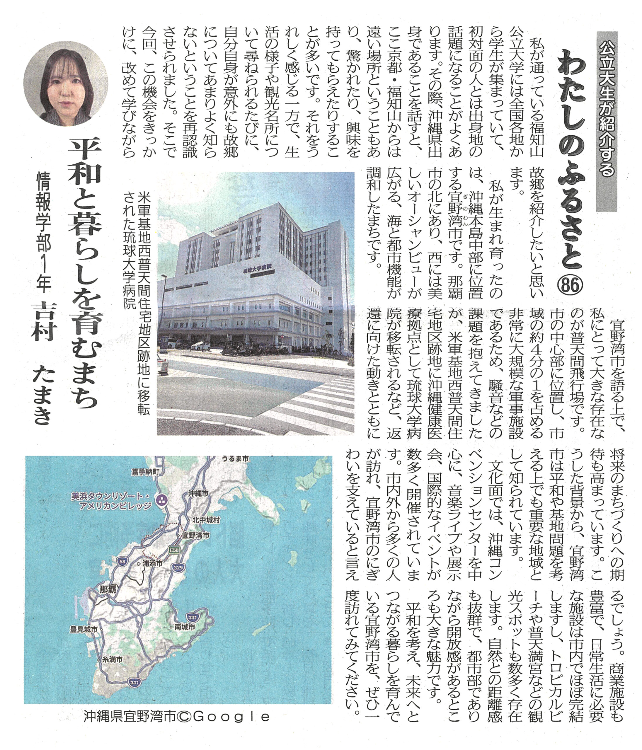 両丹日日新聞に吉村たまきさん(1年生)の記事が掲載されました レポート 2026.03.30 両丹日日新聞(2026年3月26日付け)に、「公立大生が紹介する“わたしのふるさと Vol.86”」として、吉村たまきさん(情報学部1年生)の記事が掲載されました。記事では、吉村さんの出身地である沖縄県宜野湾市について、自然と都市機能が調和したまちの魅力が紹介されているほか、普天間飛行場をめぐる地域の状況にも触れられています。 (両丹日日新聞社提供・無断複製及び転載を禁じます) 前回の記事はこちら ツイート