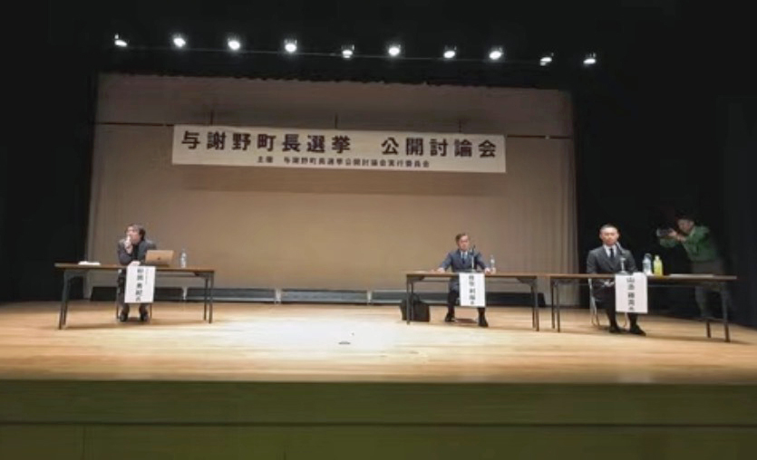 このイベントは、与謝野町長選挙公開討論会実行委員会(構成団体:与謝野町議会を考える会、京都よさの百商一気号、よさのの風)が主催したもので、佐賀利裕氏、山添藤真氏が登壇し、杉岡准教授がコーディネーターを務めました(聴衆は約360人)。