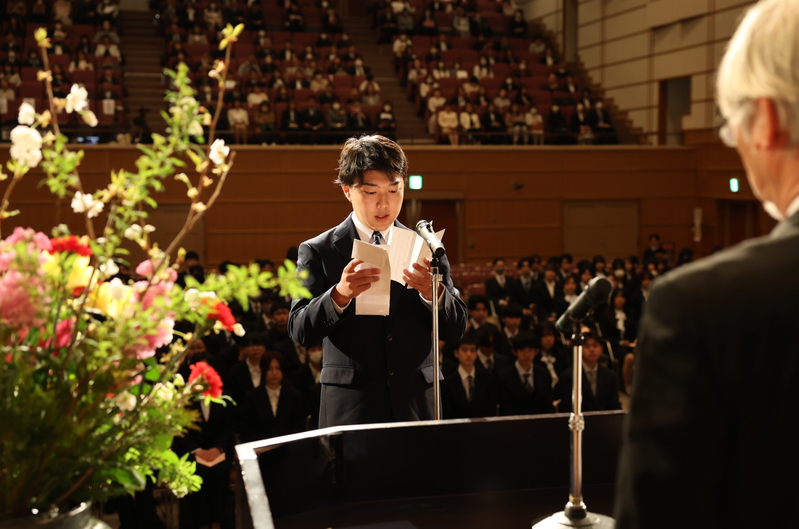 学部入学生代表の 石田凪さん(地域経営学部1年生)からは、これから始まる大学生活への期待と決意、地域社会への理解を深めながら学びを重ね、福知山市をはじめとする地域の持続的な発展に貢献できる人材をめざす思いが述べられました。