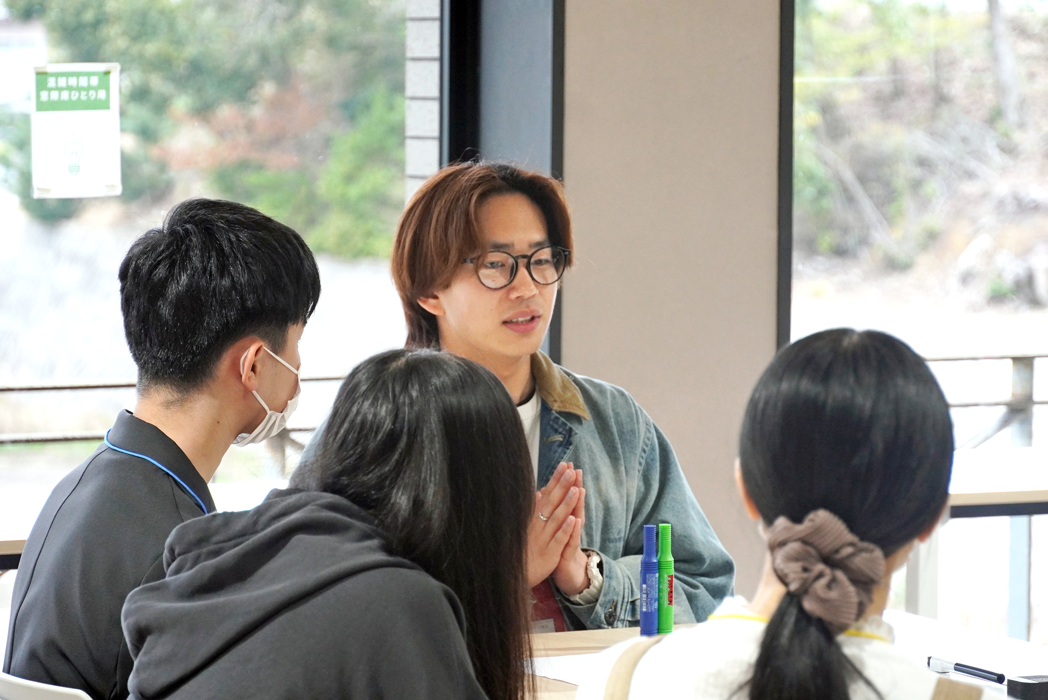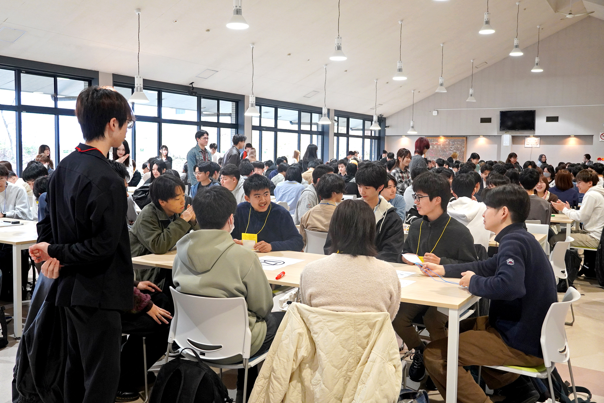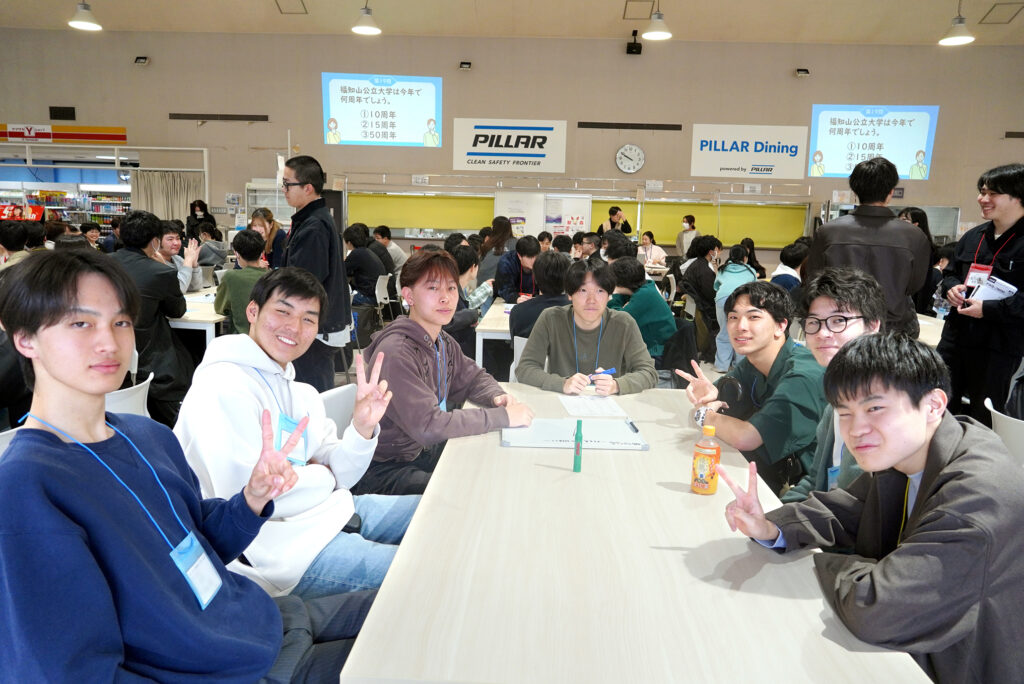 新入生たちは、出身地域が近い学生同士で話せるよう席が振り分けられ、自己紹介や地元の話、上級生を交えたフリートークなどを通して、徐々に緊張がほぐれていく様子が見られました。終盤には、学生主催によるチーム対抗の三択クイズも行われました。大学のことや、これから学びのフィールドとなる福知山や北近畿についての紹介も交えた、楽しい企画となりました。新入生の笑顔も見られ、学友会や学生ボランティアにとっても嬉しいひとときとなりました。