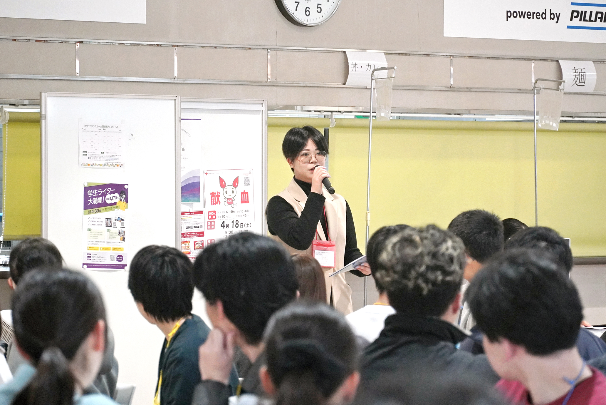 2026年4月1日(水)、入学式に先立ち、新入生が大学交流レクリエーションや各種ガイダンスに参加しました。大学交流レクリエーションでは、学友会長の木村澪さん(地域経営学部3年生)が司会を務め、有志の学生ボランティアとともに会場を盛り上げました。