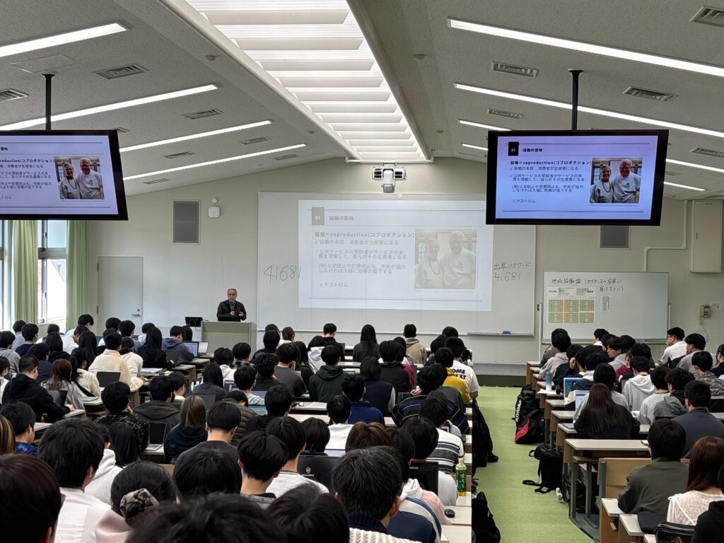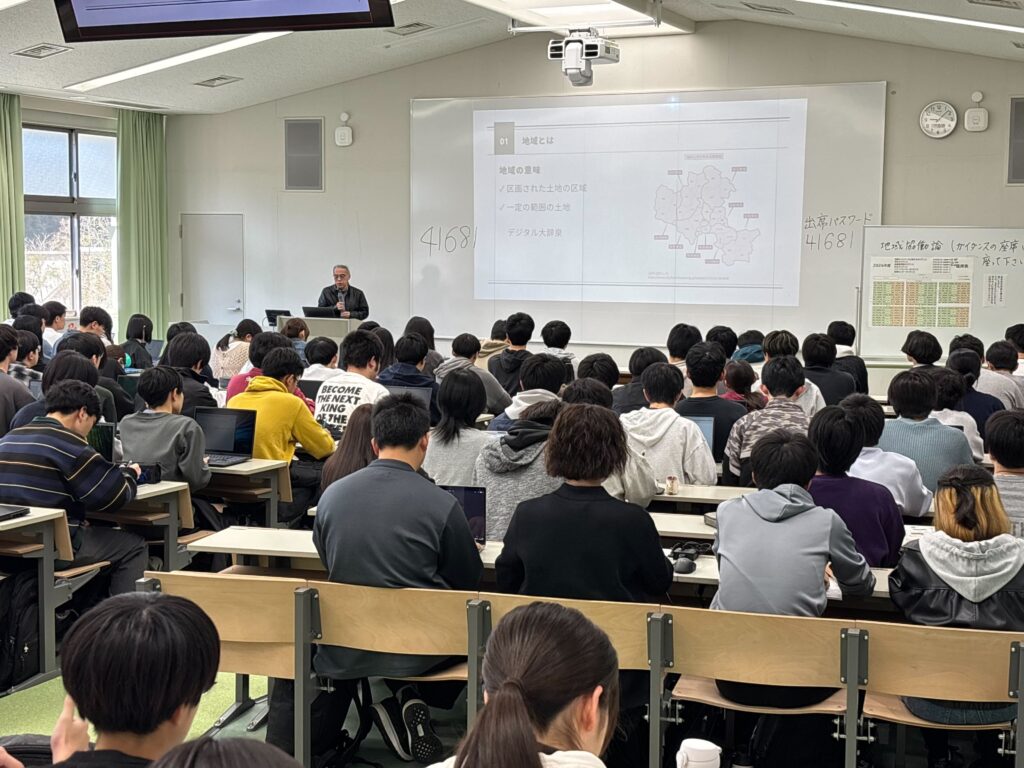 初日の1限には、講義科目「地域協働論」(基盤教育院 谷岡慎一教授)が行われました。本科目は、地域の多様な主体が連携・協力して公共的な課題を解決する「地域協働」について、理論と実践の両面から体系的に学ぶ全15回のプログラムです。