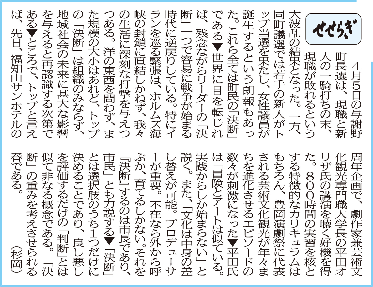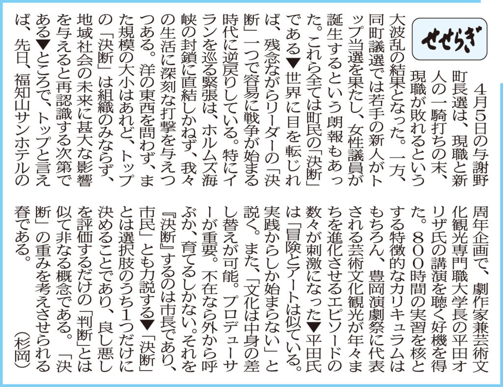 北近畿経済新聞「せせらぎ」に杉岡准教授が寄稿しました レポート 2026.04.21 北近畿経済新聞「せせらぎ」(2026年4月21日付け)に杉岡秀紀准教授(地域経営学部)が寄稿しました。 (北近畿経済新聞社提供) 前回の記事はこちら ツイート