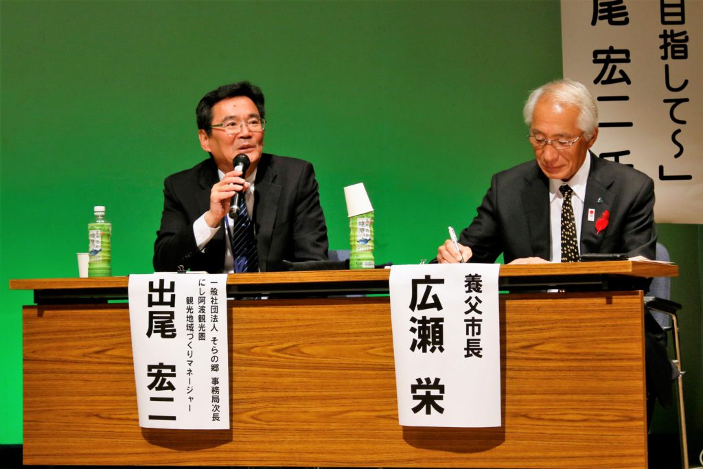 その後、出尾氏と広瀬栄養父市長によるシンポジウムが行われ、中尾誠二教授がコーディネーターを務めました。養父市の国家戦略特区を活用した耕作放棄地対策等について意見交換が行われました。
