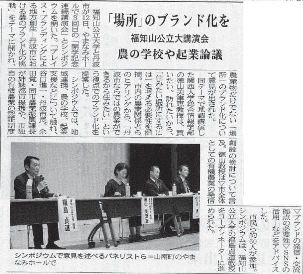 2017年11月12日(日)、2017年度第3回福知山公立大学開学記念連続講演会を丹波市(丹波市立山南住民センターやまなみホール)で開催しました。基調講演では徳山美津恵氏(関西大学総合情報学部教授)を講師にお招きし、「プレイス・ブランディングによる地方創生~丹波市における農のブランド化の挑戦~」をテーマにご講演頂きました。丹波市における農業の現状や、場所をブランド化する「プレイス・ブランディング」の方法や取組事例について約一時間にわたりご講演いただきました。