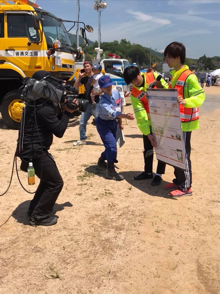 演習では市立美河小学校の児童と一緒に「土のう積み体験」を行いました。当日は京都府のブースで福知山公立大学 FASTの活動を紹介するパネル展示を行ったほか、実行委員会等の取材に応じました。